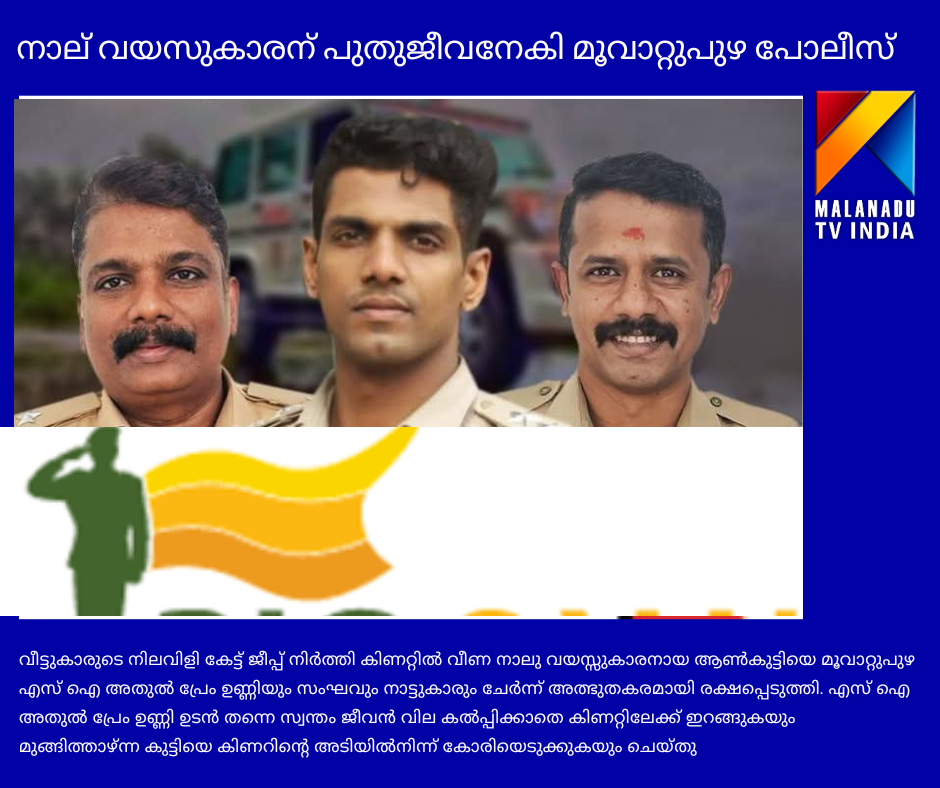 കിണറിൽ വീണ നാല് വയസുകാരന് പുതുജീവനേകി മൂവാറ്റുപുഴ പോലീസ് മൂവാറ്റുപുഴ പേഴക്കാപ്പിള്ളി പുഞ്ചേരി ഭാഗത്ത് പരാതി അന്വേഷിക്കുന്നതിന്റെ ഭാഗമായി എത്തിയപ്പോൾ വീട്ടുകാരുടെ നിലവിളി കേട്ട് ജീപ്പ് നിർത്തി കിണറ്റിൽ വീണ നാലു വയസ്സുകാരനായ ആൺകുട്ടിയെ മൂവാറ്റുപുഴ എസ് ഐ അതുൽ പ്രേം ഉണ്ണിയും സംഘവും നാട്ടുകാരും ചേർന്ന് അത്ഭുതകരമായി രക്ഷപ്പെടുത്തി. എസ് ഐ അതുൽ പ്രേം ഉണ്ണി ഉടൻ തന്നെ സ്വന്തം ജീവൻ വില കൽപ്പിക്കാതെ കിണറ്റിലേക്ക് ഇറങ്ങുകയും മുങ്ങിത്താഴ്ന്ന കുട്ടിയെ കിണറിന്റെ അടിയിൽനിന്ന് കോരിയെടുക്കുകയും ചെയ്തു. എസ്ഐക്കൊപ്പം ഉണ്ടായിരുന്ന സീനിയർ സിവിൽ പോലീസ് ഓഫീസർ രഞ്ജിത്ത് രാജനും ഉടൻ കിണറ്റിൽ ഇറങ്ങി കുട്ടിയെ എസ് ഐ ക്കൊപ്പം ചേർന്ന് കിണറ്റിനുള്ളിൽ വച്ചുതന്നെ രക്ഷാപ്രവർത്തനം നടത്തി രക്ഷപ്പെടുത്തുകയായിരുന്നു.ഒപ്പമുണ്ടായിരുന്നു എ എസ് ഐ കെ.എസ് ഷിനു നാട്ടുകാരെ വിളിച്ചു ചേർത്ത് കയറും ഗോവണിയും ഇറക്കി നൽകി ഉടൻതന്നെ കുട്ടിയെ അടുത്തുള്ള ആശുപത്രിയിൽ എത്തിക്കുകയും ചെയ്തു. പൂഞ്ചേരി ഭാഗത്തുള്ള താന്നിച്ചുവട്ടിൽ വീട്ടിൽ ഷിഹാബിൻ്റെ മകനാന്ന് അവസരോചിതമായ പ്രവർത്തനം മൂലം പുതു ജീവൻ ലഭിച്ചത്.
