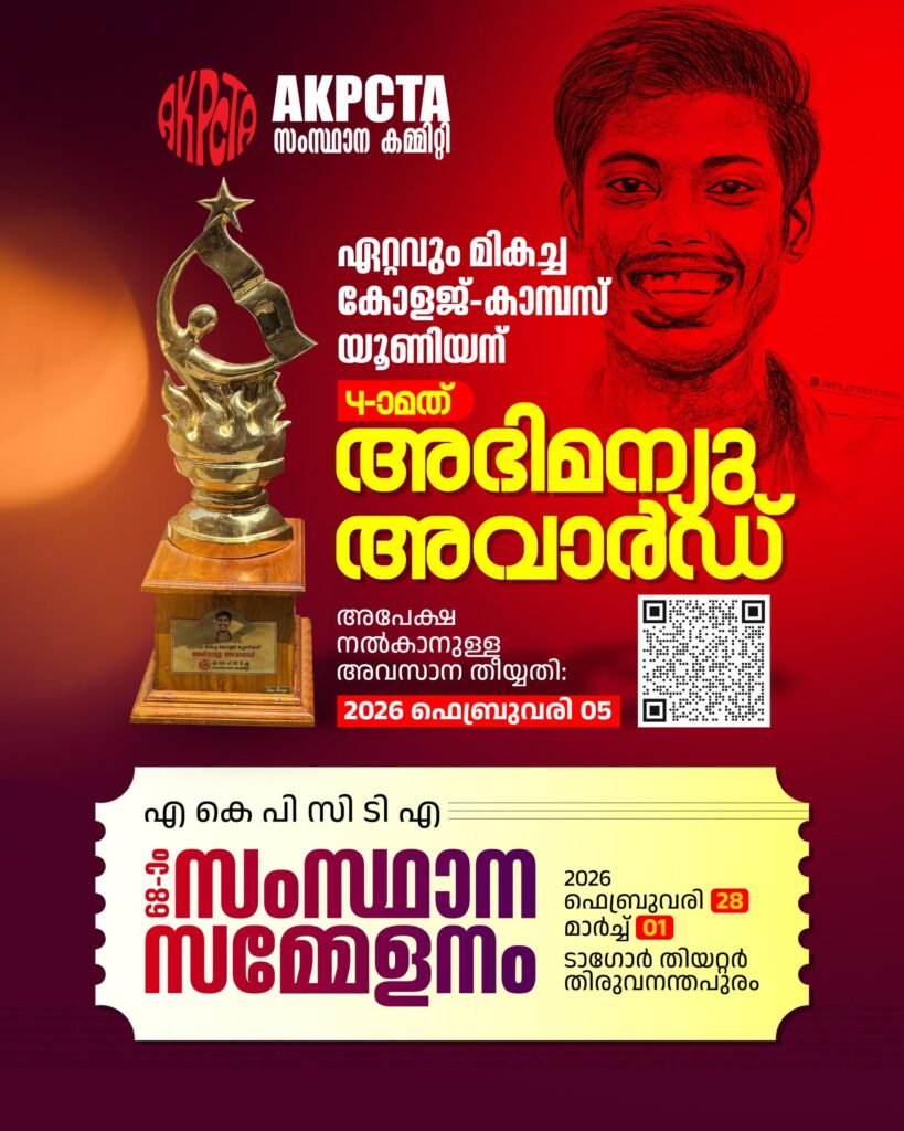 കേരളത്തിലെ മികച്ച കോളജ് – കാമ്പസ് യൂണിയനുകൾക്കായി എ കെ പി സി ടി എ സംസ്ഥാന കമ്മിറ്റി ഏർപ്പെടുത്തിയ അഭിമന്യു അവാർഡിനായുള്ള അപേക്ഷ ക്ഷണിച്ചു. 2024-25 വർഷത്തെ യൂണിയനാണ് അവാർഡ്. പ്രവർത്തന മികവിന്റെ അടിസ്ഥാനത്തിൽ മെച്ചപ്പെട്ട റിപ്പോർട്ട് നൽകുന്ന പത്ത് യൂണിയനുകളുടെ പ്രതിനിധികളുമായി അവാർഡ് നിർണയസമിതി നേരിട്ടോ ഓൺലൈൻ ആയോ കൂടിക്കാഴ്ച നടത്തിയ ശേഷമാണ് വിജയികളെ പ്രഖ്യാപിക്കുക. കോളജ് – കാമ്പസ് യൂണിയനുകൾ സാമ്പ്രദായിക രീതികളിൽ നടത്തിവരുന്ന പ്രവർത്തനങ്ങൾ, സമകാലീന വിഷയങ്ങളോട് പുലർത്തുന്ന ആഭിമുഖ്യം, ഏറ്റെടുത്ത സവിശേഷമായ മറ്റ് പദ്ധതികളുടെ നിർവ്വഹണം തുടങ്ങി വിവിധ മാനദണ്ഡങ്ങൾ അനുസരിച്ചാണ് വിധി നിർണയം നടത്തുക. ഭരണഘടനാമൂല്യങ്ങൾ, മതനിരപേക്ഷത, ജനാധിപത്യം, പൗരസ്വാതന്ത്ര്യം, ലിംഗനീതി, ഭിന്നശേഷി സൗഹൃദം, വിമർശനാത്മക രീതി, ശാസ്ത്രാവബോധം, സാമൂഹ്യനീതി, പാരിസ്ഥിതിക അവബോധം, ദളിത് പക്ഷ സമീപനം, പാർശ്വവൽക്കരിക്കപ്പെട്ടവരോടുള്ള സമീപനം, നാടോടി വിജ്ഞാനം, വികസന സങ്കൽപ്പം, പുരോഗമന വിദ്യാഭ്യാസദർശനം തുടങ്ങിയ മേഖലകളിൽ ഊന്നിയ കലാലയ പ്രവർത്തനങ്ങൾ,കലാ-സാഹിത്യ- സർഗാത്മക പ്രവർത്തനങ്ങൾ, വിനോദ പ്രവർത്തനങ്ങൾ, കലോൽസവ പങ്കാളിത്തം – സംഘാടനം, മാഗസിൻ പ്രവർത്തനങ്ങൾ, സെമിനാറുകൾ, സംവാദ സദസ്സുകൾ, മറ്റ് സംവിധാനങ്ങളുമായുള്ള പാരസ്പര്യത്തിലൂടെ കാമ്പസിൽ നടപ്പിലാക്കുന്ന വിവിധ പരിപാടികൾ എന്നിവ വിധിനിർണയത്തിൽ പ്രധാനമായും പരിഗണിക്കും. സർക്കാർ, എയ്ഡഡ്, അൺ-എയ്ഡഡ് കോളജുകൾ, സർവ്വകലാശാലാപഠന വിഭാഗങ്ങളിലെ യൂണിയനുകൾ എന്നിവയ്ക്ക് അപേക്ഷ സമർപ്പിക്കാം. സർവ്വകലാശാലാ യൂണിയനുകളെ അവാർഡിന് പരിഗണിക്കുന്നതല്ല. സർവ്വകലാശാലകൾ വിജ്ഞാപനം ചെയ്തത് പ്രകാരം കോളജുകളിൽ വിദ്യാർത്ഥി യൂണിയൻ തെരഞ്ഞെടുപ്പ് നടന്നതിന് ശേഷമുള്ള കാലയളവിലെ പ്രവർത്തനങ്ങൾ മാത്രമേ റിപ്പോർട്ടിൽ ചേർക്കാവൂ. എ കെ പി സി ടി എ വെബ്സൈറ്റ് www.akpcta.org വഴിയോ, https://forms.gle/2H3iF21ke9Sg3xyK7 എന്ന ഗൂഗിൾ ഫോം ലിങ്ക് വഴിയോ ആണ് അപേക്ഷ സമർപ്പിക്കേണ്ടത്. അപേക്ഷ ലഭിക്കാൻ ഉള്ള അവസാന തീയ്യതി : 2026 ഫെബ്രുവരി 5 കോളജ് / കാമ്പസിൻ്റെ പേര്, 2024-25 ലെ യൂണിയൻ ഭാരവാഹികളുടെ പേര്, 2024-25 സ്റ്റാഫ് അഡ്വൈസർമാരുടെ വിവരങ്ങൾ, യൂണിയൻ ഉദ്ഘാടനം മുതൽ ഇങ്ങോട്ടേക്ക് നടന്ന വിവിധ പ്രവർത്തനങ്ങളുടെ പോസ്റ്റർ, മലയാളത്തിൽ തയ്യാറാക്കിയ ഹ്രസ്വറിപ്പോർട്ടുകൾ, അവയുടെ ഫോട്ടോകൾ, നോട്ടീസുകൾ, പത്ര കട്ടിങുകൾ, മറ്റ് വിവരങ്ങൾ, പ്രിൻസിപ്പൽ / സീനിയർ അധ്യാപകർ / സ്റ്റാഫ് അഡ്വൈസർ എന്നിവരിൽ ആരെങ്കിലും ഒരാളുടെ സാക്ഷ്യപ്പെടുത്തൽ പേജ് തുടങ്ങിയവ അടങ്ങിയ ഒരു റിപ്പോർട്ട് പി ഡി എഫ് രേഖയായി വേണം വെബ്സൈറ്റ് / ഗൂഗിൾ ഫോം വഴി അപ്ലോഡ് ചെയ്യാൻ. പേജുകളുടെ എണ്ണം സംബന്ധിച്ച് പ്രത്യേകമായ നിബന്ധന ഇല്ല. വിജയികൾക്