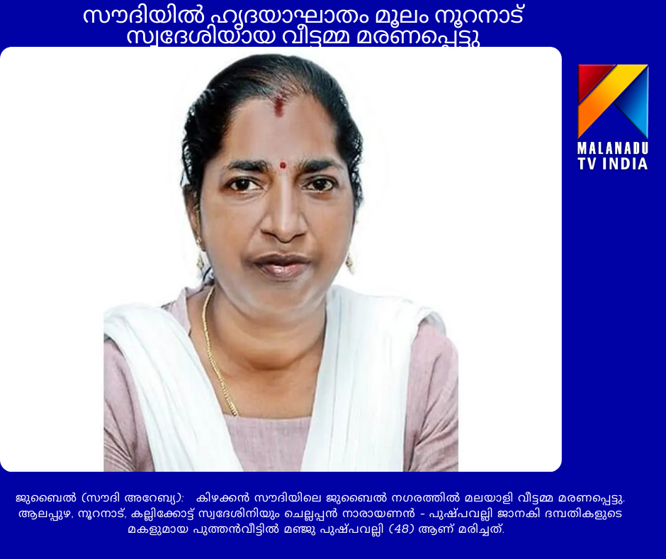 കിഴക്കൻ സൗദിയിലെ ജുബൈൽ നഗരത്തിൽ മലയാളി വീട്ടമ്മ മരണപ്പെട്ടു. ആലപ്പുഴ, നൂറനാട്, കല്ലിക്കോട്ട് സ്വദേശിനിയും ചെല്ലപ്പൻ നാരായണൻ – പുഷ്പവല്ലി ജാനകി ദമ്പതികളുടെ മകളുമായ പുത്തൻവീട്ടിൽ മഞ്ജു പുഷ്പവല്ലി (48) ആണ് മരിച്ചത്. ഭർത്താവ്: പ്രസാദ് ജനാർദ്ദനൻ (ജുബൈൽ). മകൾ: അഞ്ജലി. സഹോദരൻ: മനോജ് കുമാർ.പതിനൊന്ന് മാസം മുമ്പ് ഭർത്താവിന്റെ അടുത്തേക്ക് സന്ദർശക വിസയിലെത്തിയ മഞ്ജു അടുത്ത മാസം നാട്ടിലേക്ക് മടങ്ങാൻ തയാറെടുക്കുന്നതിനിടെയാണ് അപ്രതീക്ഷിത മരണം സംഭവിച്ചത്. ഹൃദയാഘാതമാണെന്ന് മരണ കാരണമെന്ന് ആശുപത്രി വൃത്തങ്ങൾ സ്ഥിരീകരിച്ചു.ഹൃദയസംബന്ധമായ അസുഖങ്ങൾക്ക് ഇവർ നേരത്തെ ചികിത്സ തേടിയിരുന്നു. താമസസ്ഥലത്ത് വെച്ച് അബോധാവസ്ഥയിലായ മഞ്ജുവിനെ റെഡ് ക്രസൻറ് അധികൃതർ ജുബൈൽ ജനറൽ ആശുപത്രിയിൽ എത്തിച്ചെങ്കിലും മരണപ്പെടുകയായിരുന്നു.