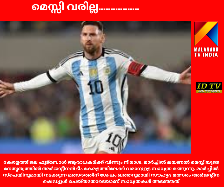 കേരളത്തിലെ ഫുട്ബോൾ ആരാധകർക്ക് വീണ്ടും നിരാശ. മാർച്ചിൽ ലയണൽ മെസ്സിയുടെ നേതൃത്വത്തിൽ അർജന്റീനൻ ടീം കേരളത്തിലേക്ക് വരാനുള്ള സാധ്യത മങ്ങുന്നു. മാർച്ചിൽ സ്പെയിനുമായി നടക്കുന്ന മത്സരത്തിന് ശേഷം ഖത്തറുമായി സൗഹൃദ മത്സരം അർജന്റീന ഷെഡ്യൂൾ ചെയ്തതോടെയാണ് സാധ്യതകൾ അടഞ്ഞത്.