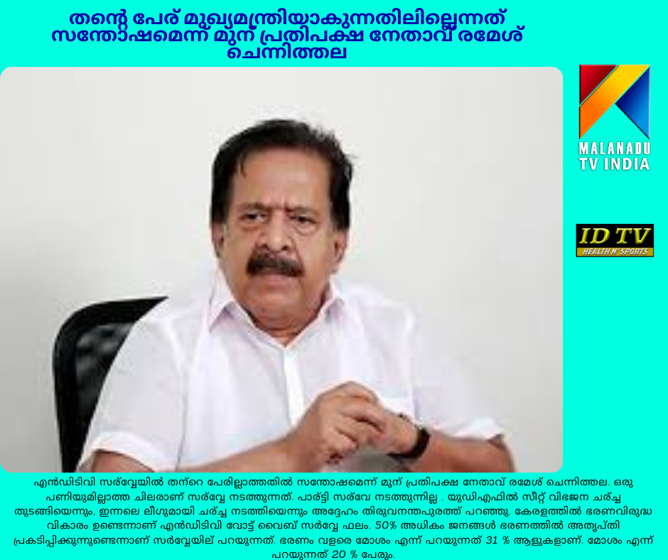 എൻഡിടിവി സര്വ്വേയിൽ തന്റെ പേരില്ലാത്തതിൽ സന്തോഷമെന്ന് മുന് പ്രതിപക്ഷ നേതാവ് രമേശ് ചെന്നിത്തല. ഒരു പണിയുമില്ലാത്ത ചിലരാണ് സര്വ്വേ നടത്തുന്നത്. പാര്ട്ടി സര്വേ നടത്തുന്നില്ല . യുഡിഎഫിൽ സീറ്റ് വിഭജന ചര്ച്ച തുടങ്ങിയെന്നും, ഇന്നലെ ലീഗുമായി ചര്ച്ച നടത്തിയെന്നും അദ്ദേഹം തിരുവനന്തപുരത്ത് പറഞ്ഞു. കേരളത്തിൽ ഭരണവിരുദ്ധ വികാരം ഉണ്ടെന്നാണ് എൻഡിടിവി വോട്ട് വൈബ് സർവ്വേ ഫലം. 50% അധികം ജനങ്ങൾ ഭരണത്തിൽ അതൃപ്തി പ്രകടിപ്പിക്കുന്നുണ്ടെന്നാണ് സർവ്വേയില് പറയുന്നത്. ഭരണം വളരെ മോശം എന്ന് പറയുന്നത് 31 % ആളുകളാണ്. മോശം എന്ന് പറയുന്നത് 20 % പേരും.40 % ആളുകളാണ് ഭരണം നല്ലതെന്ന് അഭിപ്രായപ്പെട്ടുന്നത്. കൂടാതെ 22 % പേർ വിഡി സതീശന് പിന്തുണ നല്കുന്നുണ്ട്. മുഖ്യമന്ത്രി പിണറായി വിജയനെ 18 % വും കെ കെ ശൈലജയെ 16 % പേരുമാണ് അനുകൂലിക്കുന്നത്.