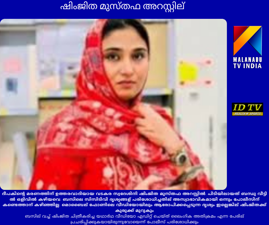 വൈറല് വീഡിയോ: ദീപകിന്റെ മരണത്തിന് ഉത്തരവാദിയായ വടകര സ്വദേശിനി ഷിംജിത മുസ്തഫ അറസ്റ്റില്. പിടിയിലായത് ബന്ധു വീട്ടില് ഒളിവില് കഴിയവെ. ബസിലെ സിസിടിവി ദൃശ്യങ്ങള് പരിശോധിച്ചതില് അസ്വാഭാവികമായി ഒന്നും പോലീസിന് കണ്ടെത്താന് കഴിഞ്ഞില്ല. മൊബൈല് ഫോണിലെ വീഡിയോയിലും ആരോപിക്കപ്പെടുന്ന ദൃശ്യം ഇല്ലെങ്കില് ഷിംജിതക്ക് കുരുക്ക് മുറുകും ബസില് വച്ച് ഷിംജിത ചിത്രീകരിച്ച യഥാര്ഥ വീഡിയോ എഡിറ്റ് ചെയ്ത് ലൈംഗിക അതിക്രമം എന്ന പേരില് പ്രചരിപ്പിക്കുകയായിരുന്നുവോയെന്ന് പോലീസ് ബന്ധു വീട്ടിൽ നിന്നും മെഡിക്കൽ കോളജ് പോലീസ് ആണ് ഇവരെ അറസ്റ്റ് ചെയ്തത്.നേരത്തെ, പോലീസ് ഇവർക്കെതിരെ ആത്മഹത്യാപ്രേരണയ്ക്ക് കേസെടുത്തിരുന്നു. ഇതിനു പിന്നാലെ ഒളിവിൽ പോയ ഷിംജിത മുസ്തഫയ്ക്കായി പോലീസ് ലുക്കൗട്ട് നോട്ടീസ് പുറത്തുവിട്ടിരുന്നു.തുടർന്ന് ഷിംജിത മുൻകൂർജാമ്യാപേക്ഷ സമർപ്പിച്ചു. കോഴിക്കോട് ജില്ലാ കോടതി അപേക്ഷ നാളെ പരിഗണിക്കാനിരിക്കെയാണ് ഇവരെ അറസ്റ്റ് ചെയ്തത്.ഷിംജിതയെ പിടികൂടാനായതോടെ ഇനി ഇവരുടെ മൊബൈല് കണ്ടെത്തി അതിലെ ദൃശ്യങ്ങള് പരിശോധിക്കാനാണ് പോലീസിന്റെ നീക്കം.ഫോണിലെ ദൃശ്യങ്ങള് നശിപ്പിച്ചിട്ടുണ്ടെങ്കില് സാങ്കേതിക വിദഗ്ധരുടെ സഹായത്തോടെ അവ വീണ്ടെടുക്കും.ബസില് വച്ച് ഷിംജിത ചിത്രീകരിച്ച യഥാർഥ വീഡിയോ എഡിറ്റ് ചെയ്ത് ലൈംഗിക അതിക്രമം എന്ന പേരില് പ്രചരിപ്പിക്കുകയായിരുന്നുവോയെന്ന് പോലീസ് പരിശോധിക്കും.ബസിലെ സിസിടിവി ദൃശ്യങ്ങള് പരിശോധിച്ചതില് അസ്വാഭാവികമായി ഒന്നും പോലീസിന് കണ്ടെത്താന് കഴിഞ്ഞില്ല. മൊബൈല് ഫോണിലെ വീഡിയോയിലും ആരോപിക്കപ്പെടുന്ന ദൃശ്യം ഇല്ലെങ്കില് ഷിംജിതക്ക് കുരുക്ക് മുറുകും.പരിശോധിക്കും