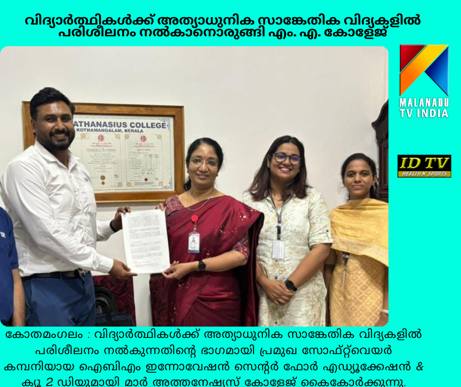 വിദ്യാർത്ഥികൾക്ക് അത്യാധുനിക സാങ്കേതിക വിദ്യകളിൽ പരിശീലനം നൽകാനൊരുങ്ങി എം. എ. കോളേജ് … ഐബിഎം ക്യൂ 2 ഡിയുമായി ധാരണാപത്രം ഒപ്പുവച്ചു …. കോതമംഗലം : വിദ്യാർത്ഥികൾക്ക് അത്യാധുനിക സാങ്കേതിക വിദ്യകളിൽ പരിശീലനം നൽകുന്നതിന്റെ ഭാഗമായി പ്രമുഖ സോഫ്റ്റ്വെയർ കമ്പനിയായ ഐബിഎം ഇന്നോവേഷൻ സെന്റർ ഫോർ എഡ്യൂക്കേഷൻ & ക്യൂ 2 ഡിയുമായി മാർ അത്തനേഷ്യസ് കോളേജ് കൈകോർക്കുന്നു. ഇതുപ്രകാരം വിദ്യാർത്ഥികൾക്ക് ഐബിഎം ക്യൂ2ഡിയിൽ എഐ, മെഷീൻ ലേർണിങ്,ഡാറ്റ സയൻസ്, ബ്ലോക്ക് ചെയിൻ,സൈബർ സെക്യൂരിറ്റി, ക്വാണ്ടം കംപ്യൂട്ടിങ് തുടങ്ങിയ മേഖലകളിൽ പരിശീലനം ലഭിക്കുകയും അതുവഴി മികച്ച തൊഴിൽ കണ്ടെത്തുന്നതിന് സഹായകരമാകുകയും ചെയ്യും. കോളജിൽ നടന്ന ചടങ്ങിൽ പ്രിൻസിപ്പൽ ഡോ. മഞ്ജു കുര്യനും ഐബിഎം ക്യൂ2ഡി സ്റ്റേറ്റ് കോർഡിനേറ്റർ നിതിൻ നവദത്തും ധാരണാപത്രത്തിൽ ഒപ്പുവച്ചു. ചടങ്ങിൽ ജില്ലാ കോർഡിനേറ്റർ അഖിൽ രത്നകുമാർ, പ്ലേസ്മെന്റ് ഓഫിസർ ആഷ്ലി ജോസ്, അധ്യാപികമാരായ ക്രിസ്റ്റീന മെറിൻ ബാബു, മിറാൻഡ പോൾ എന്നിവർ പങ്കെടുത്തു.