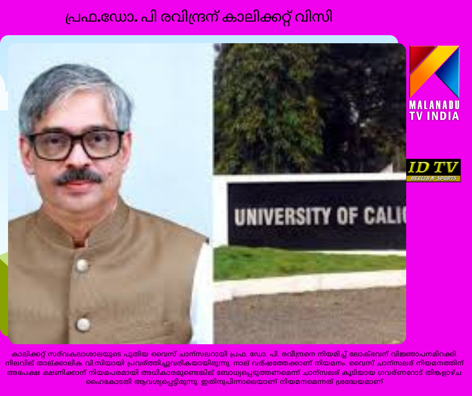 കാലിക്കറ്റ് സര്വകലാശാലയുടെ പുതിയ വൈസ് ചാന്സലറായി പ്രഫ. ഡോ. പി. രവീന്ദ്രനെ നിയമിച്ച് ലോക്ഭവന് വിജ്ഞാപനമിറക്കി. നിലവില് താല്ക്കാലിക വി.സിയായി പ്രവര്ത്തിച്ചുവരികയായിരുന്നു. നാല് വര്ഷത്തേക്കാണ് നിയമനം. വൈസ് ചാന്സലര് നിയമനത്തിന് അപേക്ഷ ക്ഷണിക്കാന് നിയമപരമായി അധികാരമുണ്ടെങ്കില് ബോധ്യപ്പെടുത്തണമെന്ന് ചാന്സലര് കൂടിയായ ഗവര്ണറോട് തിങ്കളാഴ്ച ഹൈകോടതി ആവശ്യപ്പെട്ടിരുന്നു. ഇതിനുപിന്നാലെയാണ് നിയമനമെന്നത് ശ്രദ്ധേയമാണ്