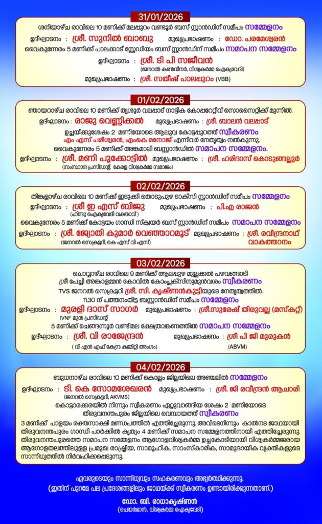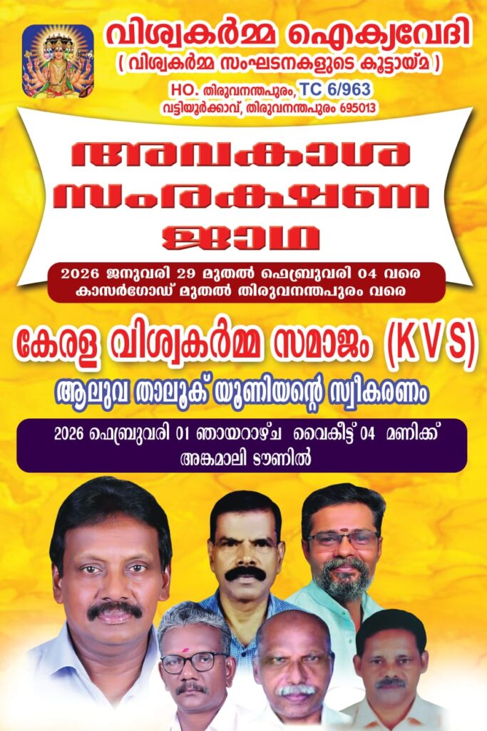 വിശ്വകര്മ്മ ഐക്യവേദി അവകാശ സംരക്ഷണ ജാഥ 29 മുതല് 4 വരെ