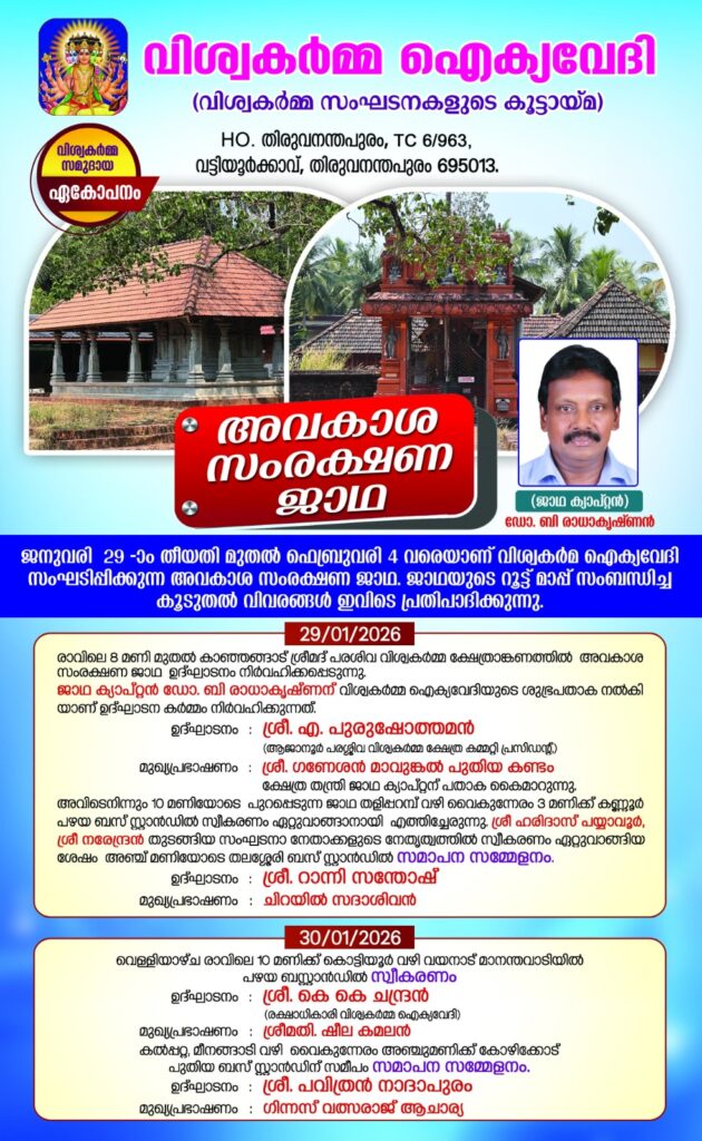 പരശു വിശ്വകര്മ ക്ഷേത്രത്തില് രാവിലെ എട്ടിന് തുടങ്ങുന്ന ജാഥയ്ക്ക് വിശ്വകര്മ്മ ക്ഷേത്ര പുരോഹിതന് ജാഥാ ക്യാപ്റ്റന് ഡോക്ടര്. ബി രാധാകൃഷ്ണന് പതാക കൈമാറ്ി ആരംഭിക്കും. വിശ്വകര്മ്മ ക്ഷേത്ര സമിതി പ്രസിഡണ്ട് എ പുരുഷോത്തമന് ഉദ്ഘാടനം ചെയ്യും. ഗണേശന് മാവുങ്കല് മുഖ്യപ്രഭാഷണം നടത്തും. ഫെബ്രുവരി 4 ന് തിരുവനന്തപുരം രക്തസാക്ഷി മണ്ഡപത്തില് ജാഥ എത്തിച്ചേരും,