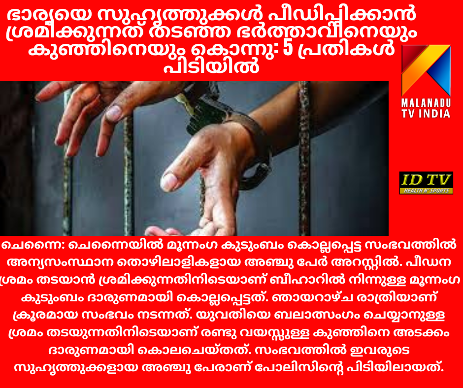 ഭാര്യയെ സുഹൃത്തുക്കള് പീഡിപ്പിക്കാന് ശ്രമിക്കുന്നത് തടഞ്ഞ ഭര്ത്താവിനെയും കുഞ്ഞിനെയും കൊന്നു: 5 പ്രതികള് പിടിയില്