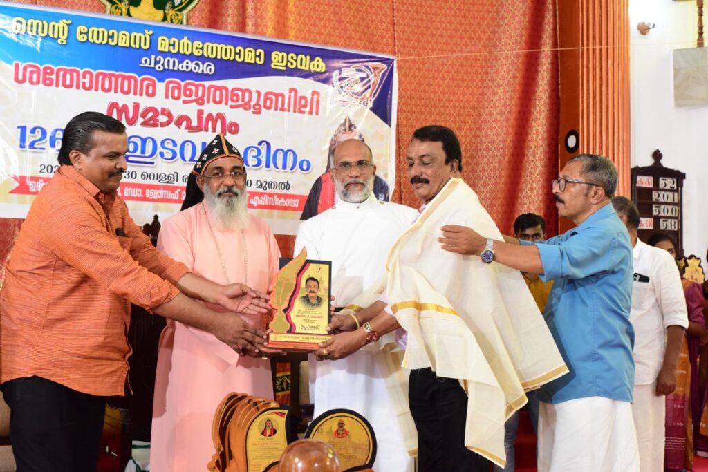 മാവേലിക്കര. ചാരുംമൂട്.ചുനക്കര സെൻ്റ് തോമസ് മാർത്തോമ്മ സിറിയൻ പള്ളിയുടെ ശതോത്തര രജത ജൂബിലിയുടെ സമാപന സമ്മേളനത്തിൽ നിരവദി ദേശിയ സംസ്ഥാന അവാർഡുകൾ നേടി പത്രപ്രവർത്തനത്തിൽ 29 വർഷം പിന്നിട്ട അനിൽ. പി. ജോർജ്. ഡോ : ജോസഫ് മാർ ഇവാനിയോസ് എപ്പിസ്കോപ്പാ . പത്തനംതിട്ട ജില്ല കുടുംബ കോടതി ജെഡിജ് ഡോണി തോമസ് വർഗീസ്, വികാരി റവ : ജോ ജോൺ , ട്രസ്റ്റി ജോൺ തോമസ് , എന്നിവർ ചേർന്ന് പുരസ്കാരം നൽകി ആദരിക്കുന്നു