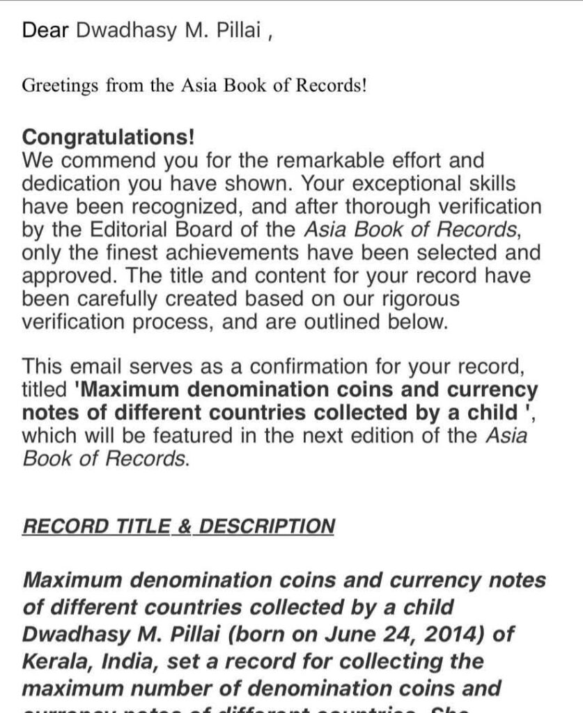 ആലപ്പുഴ: ചെറുപ്രായത്തില് ദ്വാദശി എം പിള്ള വലിയ നേട്ടം കൊയ്ത് നാടിന് അഭിമാനമായി. വിവിധ രാജ്യങ്ങളുടെ മൂല്യങ്ങളുള്ള കറന്സി ശേഖരിച്ച് ആണ് ദ്വാദശി ഏഷ്യാ ബുക്ക് ഓഫ് റിക്കോഡില് സ്ഥാനം പിടിച്ചത്. ആലപ്പുഴ ചുനക്കര സ്വദേശിനിയായ ഈ മിടുക്കി പാഠ്യവിഷയങ്ങളിലും നല്ല നേട്ടങ്ങളാണ് കൊയ്യുന്നത്. 11-ാം വയസിലാണ് ഈ നേട്ടമെന്നത് കൗതുകവും, ആശ്ചര്യജനകവുമാക്കുന്നു. 66 രാജ്യങ്ങളി്ല് നിന്ന് അപൂര്വ്വവങ്ങളും, മൂല്യങ്ങളുള്ളതുമായ 1056 അപൂര്വ്വ നാണയങ്ങളും, 54 രാജ്യങ്ങളില് നിന്ന് 223 കറന്സികളും ഈ കുട്ടി ശേഖരിച്ച് തന്റെ നേട്ടം അപൂര്വ്വതയിലപൂര്വ്വമാക്കി. ഇതാണ് ദ്വാദശിയെ് ഏഷ്യാ ബുക്ക് ഓഫ് റിക്കോഡില് സ്ഥാനം പിടിക്കാന് ഇടയാക്കിയത്. ചുനക്കര തെക്കുംമുറിയില് ദീപ-മഹേഷ് ദമ്പതികളുടെ മകളാണ് ദ്വാദശി.