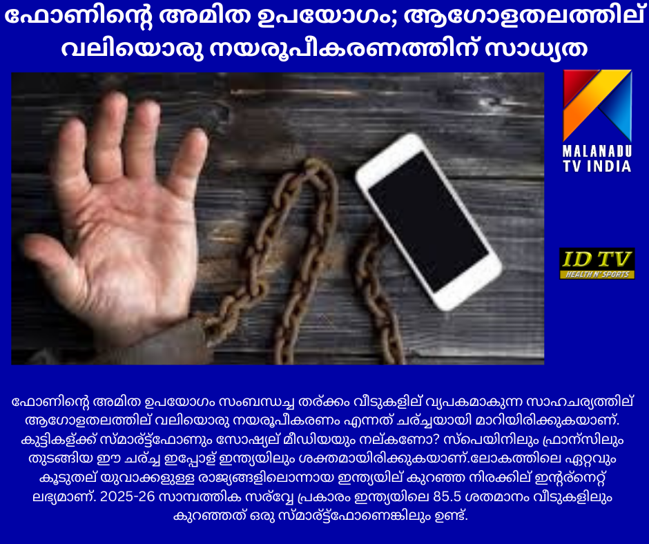 ഫോണിന്റെ അമിത ഉപയോഗം സംബന്ധച്ച തര്ക്കം വീടുകളില്് വ്യപകമാകുന്ന സാഹചര്യത്തില് ആഗോളതലത്തില് വലിയൊരു നയരൂപീകരണം എന്നത് ചര്ച്ചയായി മാറിയിരിക്കുകയാണ്. കുട്ടികള്ക്ക് സ്മാര്ട്ട്ഫോണും സോഷ്യല് മീഡിയയും നല്കണോ? സ്പെയിനിലും ഫ്രാന്സിലും തുടങ്ങിയ ഈ ചര്ച്ച ഇപ്പോള് ഇന്ത്യയിലും ശക്തമായിരിക്കുകയാണ്.ലോകത്തിലെ ഏറ്റവും കൂടുതല് യുവാക്കളുള്ള രാജ്യങ്ങളിലൊന്നായ ഇന്ത്യയില് കുറഞ്ഞ നിരക്കില് ഇന്റര്നെറ്റ് ലഭ്യമാണ്. 2025-26 സാമ്പത്തിക സര്വ്വേ പ്രകാരം ഇന്ത്യയിലെ 85.5 ശതമാനം വീടുകളിലും കുറഞ്ഞത് ഒരു സ്മാര്ട്ട്ഫോണെങ്കിലും ഉണ്ട്. ഗാസിയാബാദില് സ്മാര്ട്ട്ഫോണ് അമിതമായി ഉപയോഗിച്ചിരുന്ന സഹോദരിമാരുടെ മരണം പോലെയുള്ള സംഭവങ്ങള് ഡിജിറ്റല് ലോകത്തെ അപകടങ്ങളെക്കുറിച്ച് വലിയ ആശങ്കയാണ് ഉയര്ത്തുന്നത്.സ്മാര്ട്ട്ഫോണുകളുടെ അമിത ഉപയോഗം കുട്ടികളുടെ ശ്രദ്ധ കേന്ദ്രീകരിക്കാനുള്ള കഴിവിനെ ബാധിക്കുന്നു. ഉറക്കമില്ലായ്മ, ഉത്കണ്ഠ, പഠനത്തിലെ പിന്നോക്കാവസ്ഥ എന്നിവ ഇതിന്റെ ഫലമാണ്. സോഷ്യല് മീഡിയയിലെ ‘ഇന്ഫിനിറ്റ് സ്ക്രോള്’, ‘ഷോര്ട്ട് വീഡിയോകള്’ എന്നിവ കുട്ടികളുടെ തലച്ചോറിലെ ഡോപാമിന് ചക്രത്തെ സ്വാധീനിക്കുകയും അവരെ ഇതിന് അടിമകളാക്കുകയും ചെയ്യുന്നു.സൈബര് സുരക്ഷയും സ്വകാര്യതയും കുട്ടികള് ഒരു ഗെയിമോ ആപ്പോ ഡൗണ്ലോഡ് ചെയ്യുമ്പോള് അവരുടെ ലൊക്കേഷന്, സംസാരം, മുഖം എന്നിവയുള്പ്പെടെയുള്ള വിവരങ്ങള് മൂന്നാം കക്ഷിക്ക് കൈമാറപ്പെടുന്നു. സ്വകാര്യതാ നയങ്ങളെക്കുറിച്ച് അവബോധമില്ലാത്ത കുട്ടികള് ഡിജിറ്റല് ലോകത്ത് വലിയ ഇരകളായി മാറുന്നു.ഓണ്ലൈന് ചതിക്കുഴികള് ഗെയിമിംഗ് പ്ലാറ്റ്ഫോമുകളിലൂടെയും സോഷ്യല് മീഡിയയിലൂടെയും കുട്ടികളെ വലയിലാക്കുന്ന വേട്ടക്കാര് വര്ദ്ധിച്ചുവരികയാണ്. സുഹൃത്തുക്കളായോ അധ്യാപകരായോ അഭിനയിക്കുന്ന ഇവര് കുട്ടികളെ ദുരുപയോഗം ചെയ്യാന് സാധ്യതയുണ്ട്.