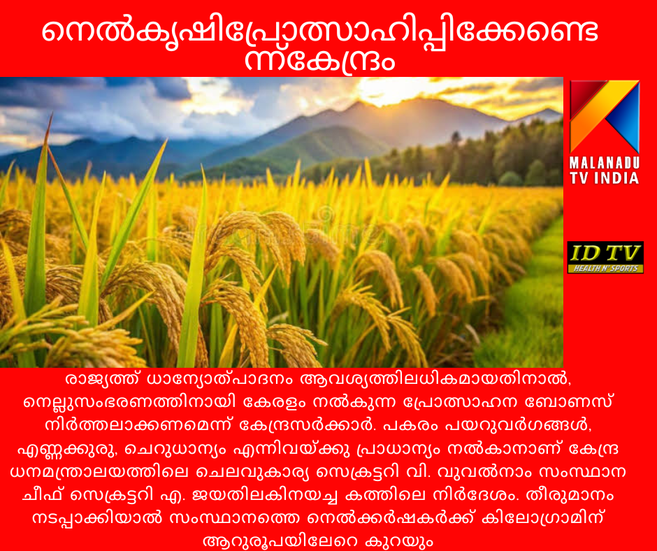 രാജ്യത്ത് ധാന്യോത്പാദനം ആവശ്യത്തിലധികമായതിനാൽ, നെല്ലുസംഭരണത്തിനായി കേരളം നൽകുന്ന പ്രോത്സാഹന ബോണസ് നിർത്തലാക്കണമെന്ന് കേന്ദ്രസർക്കാർ. പകരം പയറുവർഗങ്ങൾ, എണ്ണക്കുരു, ചെറുധാന്യം എന്നിവയ്ക്കു പ്രാധാന്യം നൽകാനാണ് കേന്ദ്ര ധനമന്ത്രാലയത്തിലെ ചെലവുകാര്യ സെക്രട്ടറി വി. വുവൽനാം സംസ്ഥാന ചീഫ് സെക്രട്ടറി എ. ജയതിലകിനയച്ച കത്തിലെ നിർദേശം. തീരുമാനം നടപ്പാക്കിയാൽ സംസ്ഥാനത്തെ നെൽക്കർഷകർക്ക് കിലോഗ്രാമിന് ആറുരൂപയിലേറെ കുറയും. ഇതു പ്രതിസന്ധി സൃഷ്ടിക്കും.കേരളം ഉൾപ്പെടെയുള്ള സംസ്ഥാന സർക്കാരുകൾ പ്രഖ്യാപിച്ച അധിക പ്രോത്സാഹന ബോണസ്, വിത്തിടലും ഉത്പാദനവുമൊക്കെ വൻതോതിൽ വർധിക്കാനിടയാക്കും. നെല്ലും ഗോതമ്പുമൊക്കെ ഉത്പാദിപ്പിക്കാൻ മറ്റു വിളകളെക്കാൾ വെള്ളവും വളവുംവേണം. അതിനാൽ, അവയുടെ അനുപാതരഹിത ഉത്പാദനം ഭൂഗർഭജലശോഷണത്തിനും മണ്ണിന്റെ പോഷകക്കുറവിനും ജൈവവൈവിധ്യ നഷ്ടത്തിനും വഴിവെക്കും. പൊതുജനാരോഗ്യത്തിനും കാലാവസ്ഥാപ്രതിരോധത്തിനുമൊക്കെ ഇതു ഗുരുതരഭീഷണിയാകും.ആവശ്യത്തെക്കാളേറെ നെല്ലും ഗോതമ്പും പൊതുവിതരണത്തിന് ലഭ്യമാണ്. അതേസമയം, പയറുവർഗങ്ങളുടെയും എണ്ണക്കുരുവിന്റെയും ഉത്പാദനം കുറവായതിനാൽ വൻതോതിൽ അവ ഇറക്കുമതി ചെയ്യേണ്ടിവരുന്നെന്ന് കേന്ദ്രം കത്തിൽ ചൂണ്ടിക്കാട്ടി.നെല്ലുസംഭരണത്തിന് കേന്ദ്രം നൽകുന്നത് 23.69 രൂപയാണ്. 6.31 രൂപയാണ് കേരളം നൽകുന്ന അധിക പ്രോത്സാഹന ബോണസ്. 5.20 രൂപയായിരുന്ന ഇത് ഒക്ടോബറിലെ മന്ത്രിസഭായോഗത്തിലാണ് കൂട്ടിയത്.