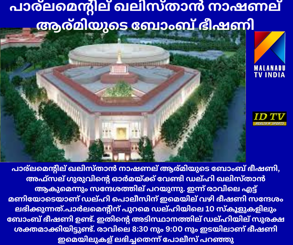 പാര്ലമെന്റില് ഖലിസ്താൻ നാഷണല് ആര്മിയുടെ ബോംബ് ഭീഷണി, അഫ്സല് ഗുരുവിന്റെ ഓർമയ്ക്ക് വേണ്ടി ഡല്ഹി ഖലിസ്താൻ ആകുമെന്നും സന്ദേശത്തില് പറയുന്നു. ഇന്ന് രാവിലെ എട്ട് മണിയോടെയാണ് ഡല്ഹി പൊലീസിന് ഇമെയില് വഴി ഭീഷണി സന്ദേശം ലഭിക്കുന്നത്.പാർലമെന്റിന് പുറമെ ഡല്ഹിയിലെ 10 സ്കൂളുകളിലും ബോംബ് ഭീഷണി ഉണ്ട്. ഇതിന്റെ അടിസ്ഥാനത്തില് ഡല്ഹിയില് സുരക്ഷ ശക്തമാക്കിയിട്ടുണ്ട്. രാവിലെ 8:30 നും 9:00 നും ഇടയിലാണ് ഭീഷണി ഇമെയിലുകള് ലഭിച്ചതെന്ന് പോലീസ് പറഞ്ഞു. മുന്നറിയിപ്പിനെ തുടർന്ന് ഡല്ഹി പോലീസ്, അഗ്നിശമന സേന, ബോംബ് നിർവീര്യമാക്കല് സ്ക്വാഡുകള് എന്നിവ ഉടൻ തന്നെ ബാധിത സ്കൂളുകളിലേക്ക് പുറപ്പെട്ടു. സൗത്ത് ഡല്ഹിയില് മൂന്ന് സ്കൂളുകള്ക്ക് ബോംബ് ഭീഷണി ലഭിച്ചു. ലോധി റോഡിലെ എയർഫോഴ്സ് സ്കൂള്, കെആർ മംഗലം സ്കൂള്, സാദിഖ് നഗറിലെ ദി ഇന്ത്യൻ സ്കൂള് എന്നിവ ഇതില് ഉള്പ്പെടും. കഴിഞ്ഞ മാസങ്ങളിലും സ്കൂളുകള്ക്ക് നേരെ ബോംബ് ഭീഷണി ഉയർത്തി വ്യാജ സന്ദേശങ്ങള് എത്തിയിരുന്നു.