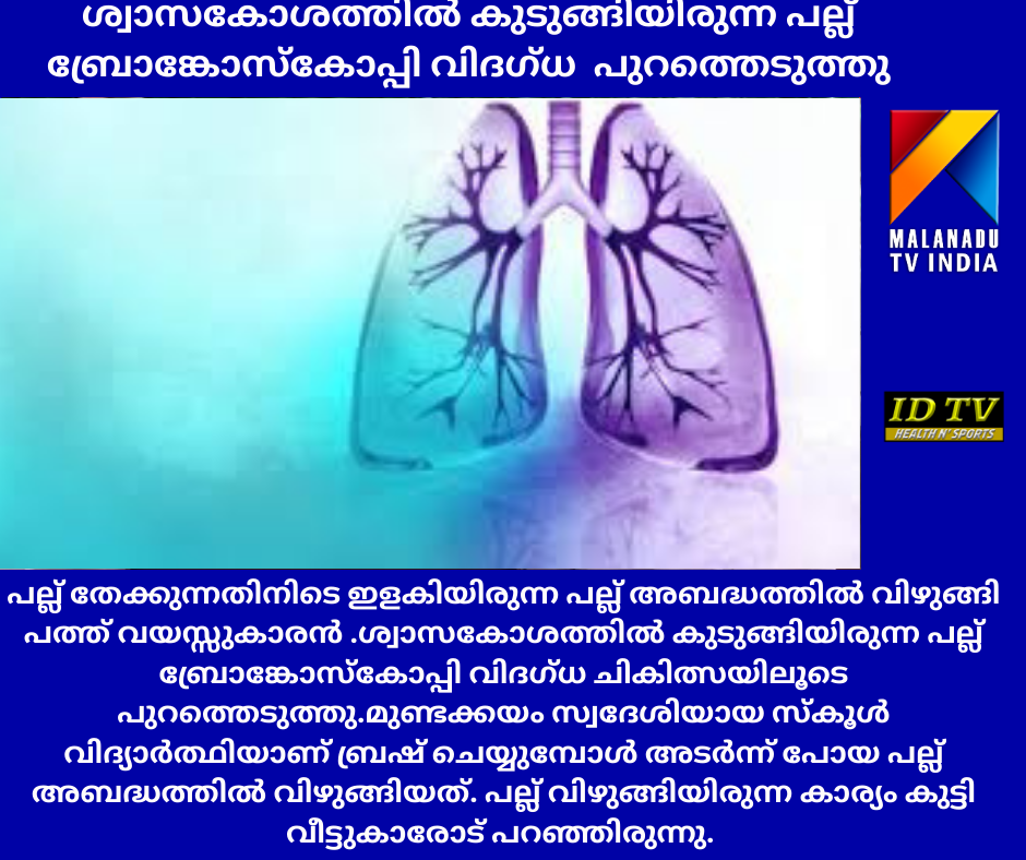 ശ്വാസകോശത്തിൽ കുടുങ്ങിയിരുന്ന പല്ല് ബ്രോങ്കോസ്കോപ്പി വിദഗ്ധ ചികിത്സയിലൂടെ പുറത്തെടുത്തു