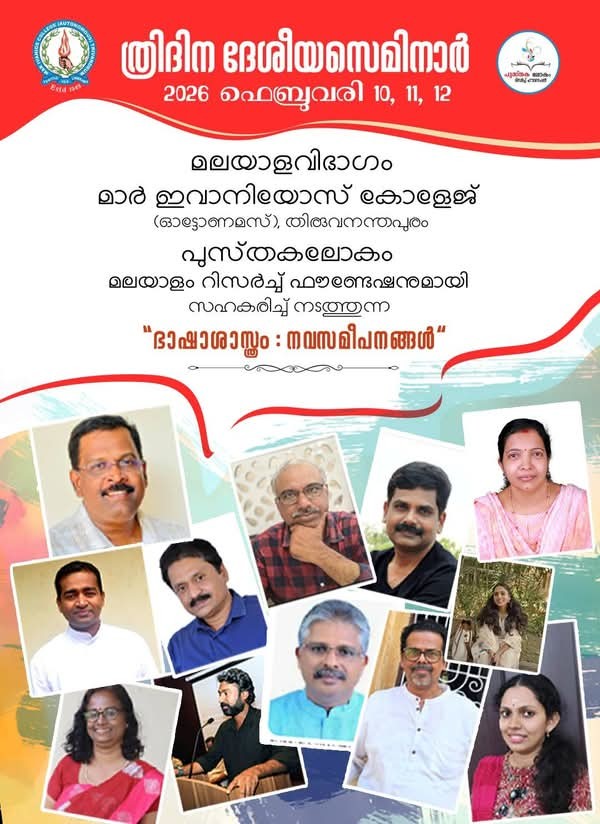 ഭാഷയുടെ ശാസ്ത്രീയ വശങ്ങളും ആധുനിക മാറ്റങ്ങളും ചര്ച്ച ചെയ്യാന് ഭാഷാസ്നേഹികളും ഗവേഷകരും തലസ്ഥാന നഗരിയില് ഒത്തുചേരുന്നു. തിരുവനന്തപുരം മാര് ഇവാനിയോസ് കോളേജ് മലയാള വിഭാഗം, പുസ്തകലോകം മലയാളം റിസര്ച്ച് ഫൗണ്ടേഷനുമായി സഹകരിച്ചാണ് ‘ഭാഷാശാസ്ത്രം: നവസമീപനങ്ങള്’ എന്ന വിഷയത്തില് ത്രിദിന ദേശീയ സെമിനാര് സംഘടിപ്പിക്കുന്നത്.