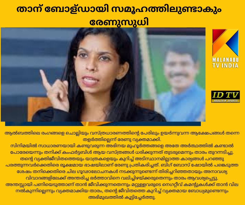 ആൽബത്തിലെ രംഗങ്ങളെ ചൊല്ലിയും വസ്ത്രധാരണത്തിന്റെ പേരിലും ഉയർന്നുവന്ന ആക്ഷേപങ്ങൾ തന്നെ തളർത്തില്ലെന്ന് രേണു വ്യക്തമാക്കി.സിനിമയിൽ സാധാരണയായി കണ്ടുവരുന്ന അഭിനയ മുഹൂർത്തങ്ങളെ അതേ അർത്ഥത്തിൽ കണ്ടാൽ പോരേയെന്നും തനിക്ക് കംഫർട്ടബിൾ ആയ വസ്ത്രങ്ങൾ ധരിക്കുന്നത് തുടരുമെന്നും താരം തുറന്നടിച്ചു.തന്റെ വ്യക്തിജീവിതത്തെയും യാത്രകളെയും കുറിച്ച് അടിസ്ഥാനമില്ലാത്ത കാര്യങ്ങൾ പറഞ്ഞു പരത്തുന്നവർക്കെതിരെ രൂക്ഷമായ ഭാഷയിലാണ് രേണു പ്രതികരിച്ചത്. ബിഗ് ബോസ് ഷോയിൽ പങ്കെടുത്ത ശേഷം തനിക്കെതിരെ ചില ഗൂഢാലോചനകൾ നടക്കുന്നുണ്ടെന്ന് തിരിച്ചറിഞ്ഞതായും അനാവശ്യ വിവാദങ്ങളിലേക്ക് അന്തരിച്ച ഭർത്താവിനെ വലിച്ചിഴയ്ക്കരുതെന്നും താരം ആവശ്യപ്പെട്ടു.അന്തസ്സായി പണിയെടുത്താണ് താൻ ജീവിക്കുന്നതെന്നും മറ്റുള്ളവരുടെ നെഗറ്റീവ് കമന്റുകൾക്ക് താൻ വില നൽകുന്നില്ലെന്നും വ്യക്തമാക്കിയ താരം, തന്റെ ജീവിതത്തെ കുറിച്ച് വ്യക്തമായ ബോധ്യമുണ്ടെന്നും അഭിമുഖത്തിൽ കൂട്ടിച്ചേർത്തു.