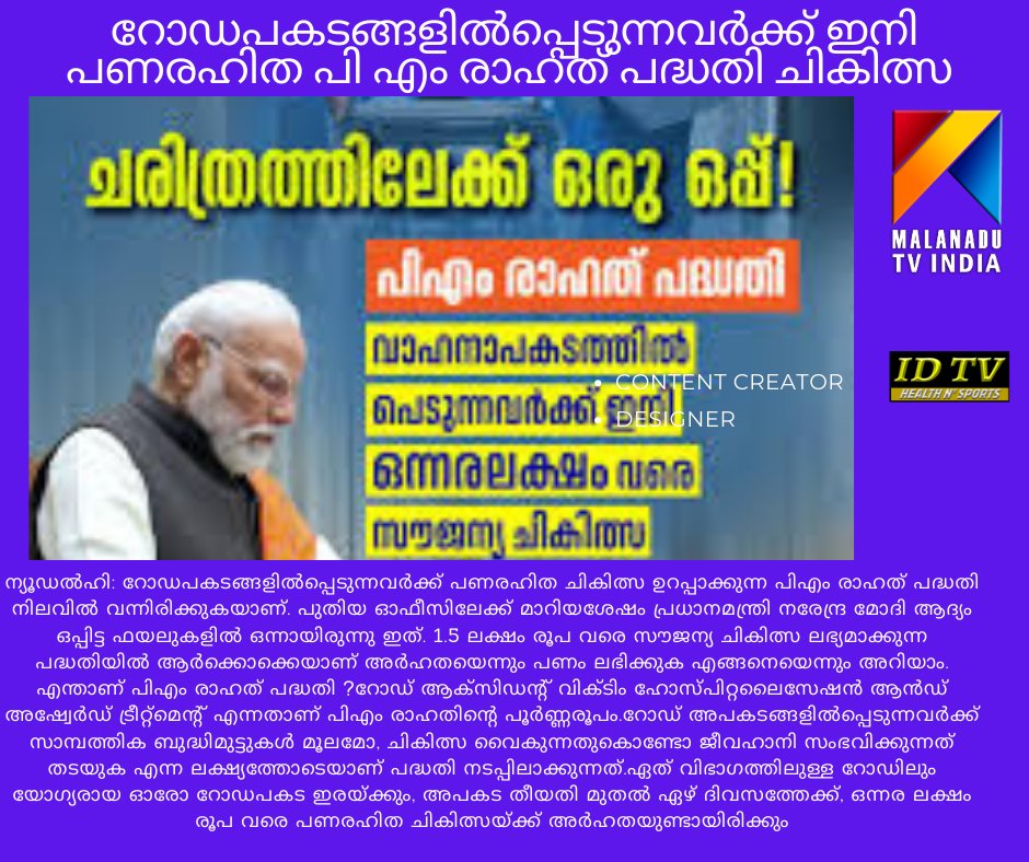ന്യൂഡൽഹി: റോഡപകടങ്ങളിൽപ്പെടുന്നവർക്ക് പണരഹിത ചികിത്സ ഉറപ്പാക്കുന്ന പിഎം രാഹത് പദ്ധതി നിലവിൽ വന്നിരിക്കുകയാണ്. പുതിയ ഓഫീസിലേക്ക് മാറിയശേഷം പ്രധാനമന്ത്രി നരേന്ദ്ര മോദി ആദ്യം ഒപ്പിട്ട ഫയലുകളിൽ ഒന്നായിരുന്നു ഇത്. 1.5 ലക്ഷം രൂപ വരെ സൗജന്യ ചികിത്സ ലഭ്യമാക്കുന്ന പദ്ധതിയിൽ ആർക്കൊക്കെയാണ് അർഹതയെന്നും പണം ലഭിക്കുക എങ്ങനെയെന്നും അറിയാം. എന്താണ് പിഎം രാഹത് പദ്ധതി ?റോഡ് ആക്സിഡൻ്റ് വിക്ടിം ഹോസ്പിറ്റലൈസേഷൻ ആൻഡ് അഷ്വേർഡ് ട്രീറ്റ്മെൻ്റ് എന്നതാണ് പിഎം രാഹതിൻ്റെ പൂർണ്ണരൂപം.റോഡ് അപകടങ്ങളിൽപ്പെടുന്നവർക്ക് സാമ്പത്തിക ബുദ്ധിമുട്ടുകൾ മൂലമോ, ചികിത്സ വൈകുന്നതുകൊണ്ടോ ജീവഹാനി സംഭവിക്കുന്നത് തടയുക എന്ന ലക്ഷ്യത്തോടെയാണ് പദ്ധതി നടപ്പിലാക്കുന്നത്.ഏത് വിഭാഗത്തിലുള്ള റോഡിലും യോഗ്യരായ ഓരോ റോഡപകട ഇരയ്ക്കും, അപകട തീയതി മുതൽ ഏഴ് ദിവസത്തേക്ക്, ഒന്നര ലക്ഷം രൂപ വരെ പണരഹിത ചികിത്സയ്ക്ക് അർഹതയുണ്ടായിരിക്കും.റോഡപകടങ്ങൾക്ക് ശേഷം അടിയന്തര വൈദ്യസഹായം ലഭിക്കാത്തതിനാൽ ആർക്കും ജീവൻ നഷ്ടപ്പെടുന്നില്ലെന്ന് ഉറപ്പാക്കാൻ സർക്കാരിൻ്റെ പ്രതിബദ്ധതയാണ് ഈ തീരുമാനം അടിവരയിടുന്നതെന്ന് റോഡ്, ഗതാഗത, ഹൈവേ മന്ത്രാലയം അറിയിച്ചു. മോട്ടോർ വാഹന അപകട ഫണ്ട് വഴിയാണ് ആശുപത്രികൾക്ക് പണം തിരികെ നൽകുക.രാജ്യത്ത് റോഡപകടങ്ങൾ മൂലമുണ്ടാകുന്ന മരണനിരക്ക് ഉയര്ന്ന തോതിലാണ് ഓരോവര്ഷവും രേഖപ്പെടുത്തുന്നത്. ഇതിൽ പലതും കൃത്യസമയത്ത് വൈദ്യസഹായം ലഭിച്ചാൽ തടയാവുന്നതാണ്. അപകടം സംഭവിച്ച് ആദ്യ മണിക്കൂറിനകം ആശുപത്രിയിലെത്തിച്ചാൽ റോഡപകട മരണങ്ങളിൽ 50 ശതമാനത്തോളം ഒഴിവാക്കാനാകുമെന്നാണ് പഠനങ്ങൾ പറയുന്നത്.പിഎം രാഹത് പദ്ധതി നടപ്പാക്കുന്നത് എങ്ങനെ?അടിയന്തര പ്രതികരണ പിന്തുണാ സംവിധാനമായ 112 ഹെൽപ്ലൈനിലൂടെ ‘സുവര്ണ മണിക്കൂറില്’ തന്നെ ആശുപത്രിയിൽ എത്തുന്നുവെന്ന് ഉറപ്പാക്കുന്നു. അപകടത്തിൽപ്പെട്ടവർക്കോ അവരെ സഹായിക്കുന്നവർക്കോ 112 ഡയൽ ചെയ്ത് സമീപത്തെ ആശുപത്രി വിവരങ്ങൾ അറിയാനും ആംബുലൻസ് സഹായം അഭ്യർഥിക്കാനുമാകും. അടിയന്തര സേവന വിഭാഗങ്ങളുടെയും പോലീസ് അധികാരികളുടെയും ആശുപത്രികളുടെയും ദ്രുതഗതിയിലെ ഏകോപനം ഇതിലൂടെ സാധ്യമാകുന്നു.പദ്ധതി പ്രകാരം ഏത് തരം റോഡിലുണ്ടാകുന്ന അപകടമായാലും അപകടത്തില്പെട്ട അർഹരായ ഓരോരുത്തരും അപകടമുണ്ടായ തീയതി മുതൽ 7 ദിവസത്തേക്ക് 1.5 ലക്ഷം രൂപ വരെ പണരഹിത സൗജന്യ ചികിത്സയ്ക്ക് അർഹരായിരിക്കും. സംയോജിത ഡിജിറ്റൽ സംവിധാനത്തിലെ പൊലീസ് പരിശോധനയ്ക്ക് വിധേയമായി ജീവഹാനിക്ക് സാധ്യതയില്ലാത്ത കേസുകളിൽ 24 മണിക്കൂർ വരെയും ജീവഹാനിക്ക് സാധ്യതയുള്ള കേസുകളിൽ 48 മണിക്കൂർ വരെയും അടിയന്തര ചികിത്സ നൽകും.കേന്ദ്ര റോഡ് ഗതാഗത ഹൈവേ മന്ത്രാലയത്തിൻ്റെ ഇലക്ട്രോണിക് ഡീറ
