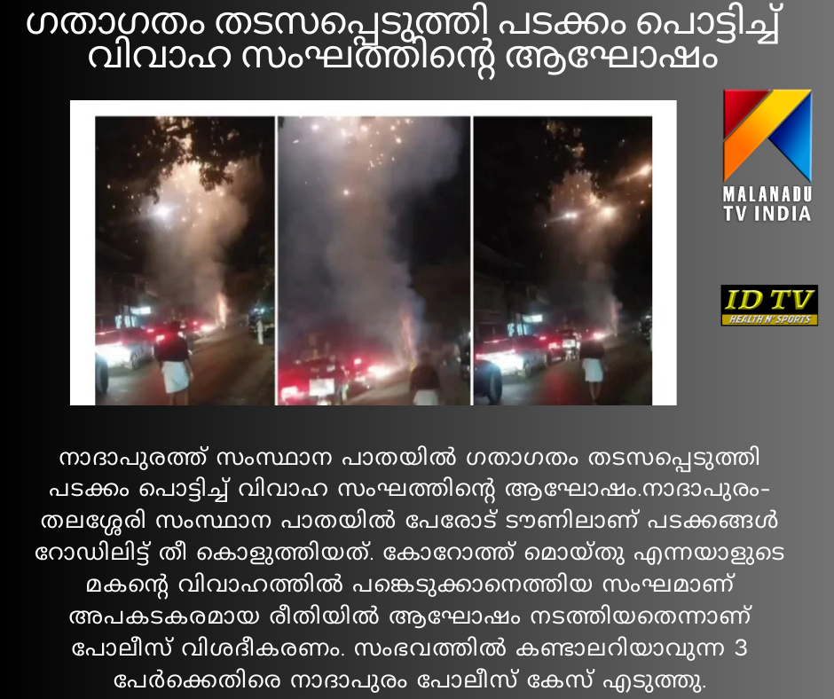 കോഴിക്കോട് : നാദാപുരത്ത് സംസ്ഥാന പാതയിൽ ഗതാഗതം തടസപ്പെടുത്തി പടക്കം പൊട്ടിച്ച് വിവാഹ സംഘത്തിന്റെ ആഘോഷം.നാദാപുരം-തലശ്ശേരി സംസ്ഥാന പാതയിൽ പേരോട് ടൗണിലാണ് പടക്കങ്ങൾ റോഡിലിട്ട് തീ കൊളുത്തിയത്. കോറോത്ത് മൊയ്തു എന്നയാളുടെ മകൻ്റെ വിവാഹത്തിൽ പങ്കെടുക്കാനെത്തിയ സംഘമാണ് അപകടകരമായ രീതിയിൽ ആഘോഷം നടത്തിയതെന്നാണ് പോലീസ് വിശദീകരണം. സംഭവത്തിൽ കണ്ടാലറിയാവുന്ന 3 പേർക്കെതിരെ നാദാപുരം പോലീസ് കേസ് എടുത്തു.