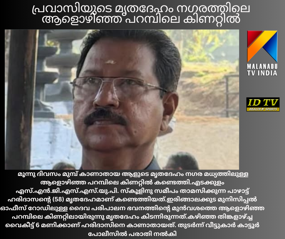 ഇരിങ്ങാലക്കുട : മൂന്നു ദിവസം മുമ്പ് കാണാതായ ആളുടെ മൃതദേഹം നഗര മധ്യത്തിലുള്ള ആളൊഴിഞ്ഞ പറമ്പിലെ കിണറ്റിൽ കണ്ടെത്തി.എടക്കുളം എസ്.എൻ.ജി.എസ്.എസ്.യു.പി. സ്കൂളിനു സമീപം താമസിക്കുന്ന പാഴാട്ട് ഹരിദാസന്റെ (58) മൃതദേഹമാണ് കണ്ടെത്തിയത്.ഇരിങ്ങാലക്കുട മുനിസിപ്പൽ ഓഫീസ് റോഡിലുള്ള ദൈവ പരിപാലന ഭവനത്തിൻ്റെ മുൻവശത്തെ ആളൊഴിഞ്ഞ പറമ്പിലെ കിണറ്റിലായിരുന്നു മൃതദേഹം കിടന്നിരുന്നത്.കഴിഞ്ഞ തിങ്കളാഴ്ച്ച വൈകീട്ട് 6 മണിക്കാണ് ഹരിദാസിനെ കാണാതായത്. തുടർന്ന് വീട്ടുകാർ കാട്ടൂർ പോലീസിൽ പരാതി നൽകി.സി.സി.ടി.വി. കേന്ദ്രീകരിച്ച് പോലീസ് നടത്തിയ അന്വേഷണത്തിലാണ് ആൾമറയില്ലാത്ത കിണറ്റിൽ ഹരിദാസിനെ മരിച്ച നിലയിൽ കണ്ടെത്തിയത്.മകളുടെ വിവാഹത്തിനായി ഏതാനും ആഴ്ച്ചകൾക്കു മുമ്പാണ് ഖത്തറിൽ ജോലി ചെയ്യുന്ന ഹരിദാസ് ലീവിൽ നാട്ടിലെത്തിയത്.ഇരിങ്ങാലക്കുട അഗ്നിരക്ഷാ സേനയും പോലീസും ചേർന്നാണ് മൃതദേഹം പുറത്തെടുത്തത്. പറമ്പിലേക്ക് കയറുന്നിടത്ത് ഒരു വശത്ത് മതിലിനോടു ചേർന്നാണ് ആൾമറയില്ലാത്ത ഈ കിണർ. ഇതിനു മുൻപ് ഈ കിണറ്റിൽ വീണ രണ്ടുപേരെ അഗ്നിരക്ഷാ സേന രക്ഷപ്പെടുത്തിയിട്ടുണ്ട്.മൃതദേഹം ഇരിങ്ങാലക്കുട സഹകരണ ആശുപത്രിയിലേക്ക് മാറ്റി.ഭാര്യ : പ്രീതിമക്കൾ : ഹൃദ്യ, നവ്യമരുമകൻ : മണികണ്ഠൻ