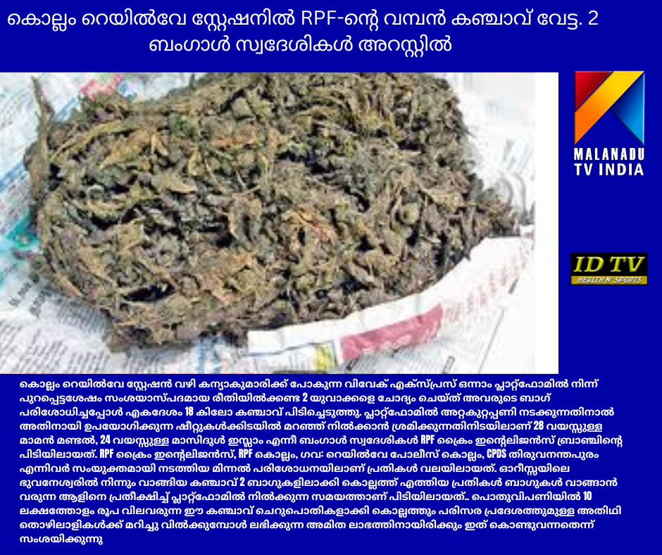 കൊല്ലം റെയിൽവേ സ്റ്റേഷൻ വഴി കന്യാകുമാരിക്ക് പോകുന്ന വിവേക് എക്സ്പ്രസ് ഒന്നാം പ്ലാറ്റ്ഫോമിൽ നിന്ന് പുറപ്പെട്ടശേഷം സംശയാസ്പദമായ രീതിയിൽക്കണ്ട 2 യുവാക്കളെ ചോദ്യം ചെയ്ത് അവരുടെ ബാഗ് പരിശോധിച്ചപ്പോൾ എകദേശം 18 കിലോ കഞ്ചാവ് പിടിച്ചെടുത്തു. പ്ലാറ്റ്ഫോമിൽ അറ്റകുറ്റപ്പണി നടക്കുന്നതിനാൽ അതിനായി ഉപയോഗിക്കുന്ന ഷീറ്റുകൾക്കിടയിൽ മറഞ്ഞ് നിൽക്കാൻ ശ്രമിക്കുന്നതിനിടയിലാണ് 28 വയസ്സുള്ള മാമൻ മണ്ടൽ, 24 വയസ്സുള്ള മാസിദുൾ ഇസ്ലാം എന്നീ ബംഗാൾ സ്വദേശികൾ RPF ക്രൈം ഇൻ്റെലിജൻസ് ബ്രാഞ്ചിന്റെ പിടിയിലായത്. RPF ക്രൈം ഇന്റെലിജൻസ്, RPF കൊല്ലം, ഗവ: റെയിൽവേ പോലീസ് കൊല്ലം, CPDS തിരുവനന്തപുരം എന്നിവർ സംയുക്തമായി നടത്തിയ മിന്നൽ പരിശോധനയിലാണ് പ്രതികൾ വലയിലായത്. ഓറീസ്സയിലെ ഭുവനേശ്വരിൽ നിന്നും വാങ്ങിയ കഞ്ചാവ് 2 ബാഗുകളിലാക്കി കൊല്ലത്ത് എത്തിയ പ്രതികൾ ബാഗുകൾ വാങ്ങാൻ വരുന്ന ആളിനെ പ്രതീക്ഷിച്ച് പ്ലാറ്റ്ഫോമിൽ നിൽക്കുന്ന സമയത്താണ് പിടിയിലായത്.. പൊതുവിപണിയിൽ 10 ലക്ഷത്തോളം രൂപ വിലവരുന്ന ഈ കഞ്ചാവ് ചെറുപൊതികളാക്കി കൊല്ലത്തും പരിസര പ്രദേശത്തുമുള്ള അതിഥി തൊഴിലാളികൾക്ക് മറിച്ചു വിൽക്കുമ്പോൾ ലഭിക്കുന്ന അമിത ലാഭത്തിനായിരിക്കും ഇത് കൊണ്ടുവന്നതെന്ന് സംശയിക്കുന്നു. മാമൻ മണ്ടൽ ഇതിനു മുൻപും കഞ്ചാവ് കടത്തിയ തിന് മൂവാറ്റുപുഴയിൽ പിടിയിലാവുകയും ജയിൽ ശിക്ഷയും അനുഭവിച്ചിട്ടുണ്ട്.ഇവരുമായി ബന്ധമുള്ള ആളുകളുടെ വിവരങ്ങൾ ശേഖരിച്ചു കൊണ്ടിരിക്കുന്നതായി പോലിസ് പറഞ്ഞു. സമാന രീതിയിൽ കഴിഞ്ഞ ദിവസങ്ങളിൽ ആലപ്പുഴ, ആലുവ,, എറണാകുളം റെയിൽവേ സ്റ്റേഷനുകളിൽ നിന്ന് എകദേശം 80 കിലോ കഞ്ചാവ് RPF പിടികൂടിയിരുന്നു. RPF തിരുവനന്തപുരം ഡിവിഷണൽ സെക്യൂരിറ്റി കമ്മീഷണർ ശ്രി.മുഹമ്മദ് ഹനീഫയുടെ നിർദ്ദേശത്താൽ RPF കൊല്ലം ഇൻസ്പെക്ടർ അനീഷ്.T. A , ക്രൈം ഇൻ്റെലിജൻസ് ഇൻസ്പെക്ടർ ജിപിൻ A.J ,കൊല്ലം GRP SH0 ശ്യാമകുമാരി എന്നിവരുടെ പ്രത്യേക മേൽനോട്ടത്തിൽ RPF ക്രൈം ഇൻ്റെലിജൻസ് ഉദ്യോഗസ്ഥരായ പ്രെയ്സ് മാത്യു, ഫിലിപ്സ് ജോൺ, സിജോ സേവ്യർ, S.V.ജോസ്, ബിന്ദു, ജ്യോതിന്ദ്രൻ, ബിജു എബ്രഹാം, സജീവ് ,അഖിൽ ഡാൻസാഫ് അംഗങ്ങളായ സുനിൽ, കൃഷ്ണലാൽ, എന്നിവടങ്ങിയ സംഘമാണ് പ്രതിയെ വലയിലാക്കിയത്. കഴിഞ്ഞ വർഷം മാത്രം 570 കിലോ കഞ്ചാവും 45 പ്രതികളേയും RPF ക്രൈം ഇൻ്റെലിജൻസ് പിടികൂടിയിട്ടുണ്ട്.. പൊതുവിപണിയിൽ ലഹരിയുടെ ഉപയോഗം ഇപ്പോഴും ശക്തമാണ് എന്നതിൻ്റെ തെളിവാണ് ഇന്ന് നടന്ന കഞ്ചാവ് വേട്ട എന്നും,കൂടാതെ ട്രെയിനുകളിലും, പ്ലാറ്റ്ഫോമുകളിലും പ്രത്യേക പരിശോധനകൾ ശക്തമായി തുടരുമെന്നും ക്രൈം ഇൻ്റെലിജൻസ് ഇൻസ്പെക്ടർ ജിപിൻ A.J അറിയിച്ചു.പ്രതികളെ വിശദമായ മെഡിക്കൽ പരിശോധനക്ക് ശേഷം കോടതിൽ ഹാജരാക്കും.