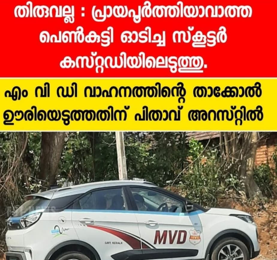 തിരുവല്ല പൊടിയാടിയിൽ 17 കാരി മകൾ ഓടിച്ച സ്കൂട്ടറിൻ്റെ താക്കോൽ മോട്ടോർ വാഹന വകുപ്പ് ഉദ്യോഗസ്ഥർ ഊരി എടുത്തതറിഞ്ഞ് സ്ഥലത്തെത്തിയ പിതാവ് മോട്ടോർ വാഹന വകുപ്പിൻ്റെ വാഹനത്തിൻ്റെ താക്കോൽ ഊരിയെടുത്തു