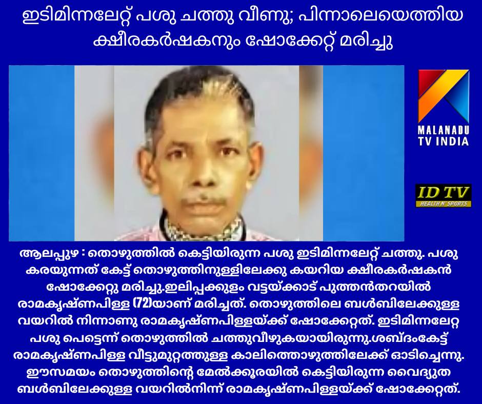 തൊഴുത്തില് ഇടിമിന്നലേറ്റ് പശു ചത്തു വീണു; പിന്നാലെയെത്തിയ ക്ഷീരകര്ഷകന് ഷോക്കേറ്റ് മരിച്ചു. ദാരുണ സംഭവം നടന്നത് ആലപ്പുഴയിൽ