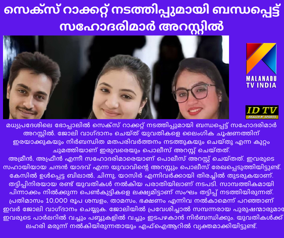 മധ്യപ്രദേശിലെ ഭോപ്പാലില് സെക്സ് റാക്കറ്റ് നടത്തിപ്പുമായി ബന്ധപ്പെട്ട് സഹോദരിമാര് അറസ്റ്റില്. ജോലി വാഗ്ദാനം ചെയ്ത് യുവതികളെ ലൈംഗിക ചൂഷണത്തിന് ഇരയാക്കുകയും നിര്ബന്ധിത മതപരിവര്ത്തനം നടത്തുകയും ചെയ്തു എന്ന കുറ്റം ചുമത്തിയാണ് ഇരുവരെയും പൊലീസ് അറസ്റ്റ് ചെയ്തത്.അമ്രീന്, അഫ്രീന് എന്നീ സഹോദരിമാരെയാണ് പൊലീസ് അറസ്റ്റ് ചെയ്തത്. ഇവരുടെ സഹായിയായ ചന്ദന് യാദവ് എന്ന യുവാവിന്റെ അറസ്റ്റും പൊലീസ് രേഖപ്പെടുത്തിയിട്ടുണ്ട്. കേസില് ഉള്പ്പെട്ട ബിലാല്, ചിന്നു, യാസിര് എന്നിവര്ക്കായി തിരച്ചില് തുടരുകയാണ്.തട്ടിപ്പിനിരയായ രണ്ട് യുവതികള് നല്കിയ പരാതിയിലാണ് നടപടി. സാമ്പത്തികമായി പിന്നാക്കം നില്ക്കുന്ന പെണ്കുട്ടികളെ ലക്ഷ്യമിട്ടാണ് സംഘം തട്ടിപ്പ് നടത്തിയിരുന്നത്. പ്രതിമാസം 10,000 രൂപ ശമ്പളം, താമസം, ഭക്ഷണം എന്നിവ നല്കാമെന്ന് പറഞ്ഞാണ് ഇവര് ജോലി വാഗ്ദാനം ചെയ്യുക. ജോലിയില് പ്രവേശിച്ചാല് സമ്പന്നരായ പുരുഷന്മാരുമായി ഇവരുടെ പാര്ലറില് വച്ചും പബ്ബുകളില് വച്ചും ഇടപഴകാന് നിര്ബന്ധിക്കും. യുവതികള്ക്ക് ലഹരി മരുന്ന് നല്കിയിരുന്നതായും എഫ്ഐആറില് വ്യക്തമാക്കിയിട്ടുണ്ട്.