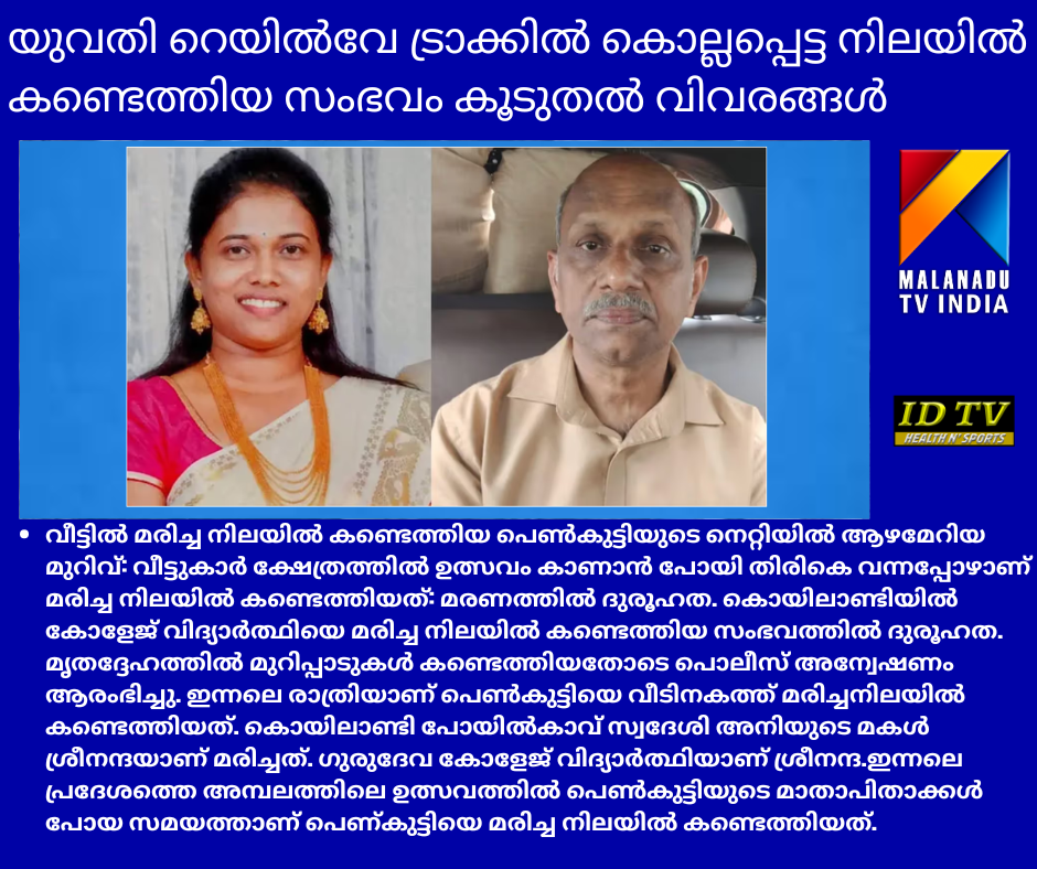 യുവതി റെയിൽവേ ട്രാക്കിൽ കൊല്ലപ്പെട്ട നിലയിൽ കണ്ടെത്തിയ സംഭവം കൂടുതൽ വിവരങ്ങൾ പുറത്ത്