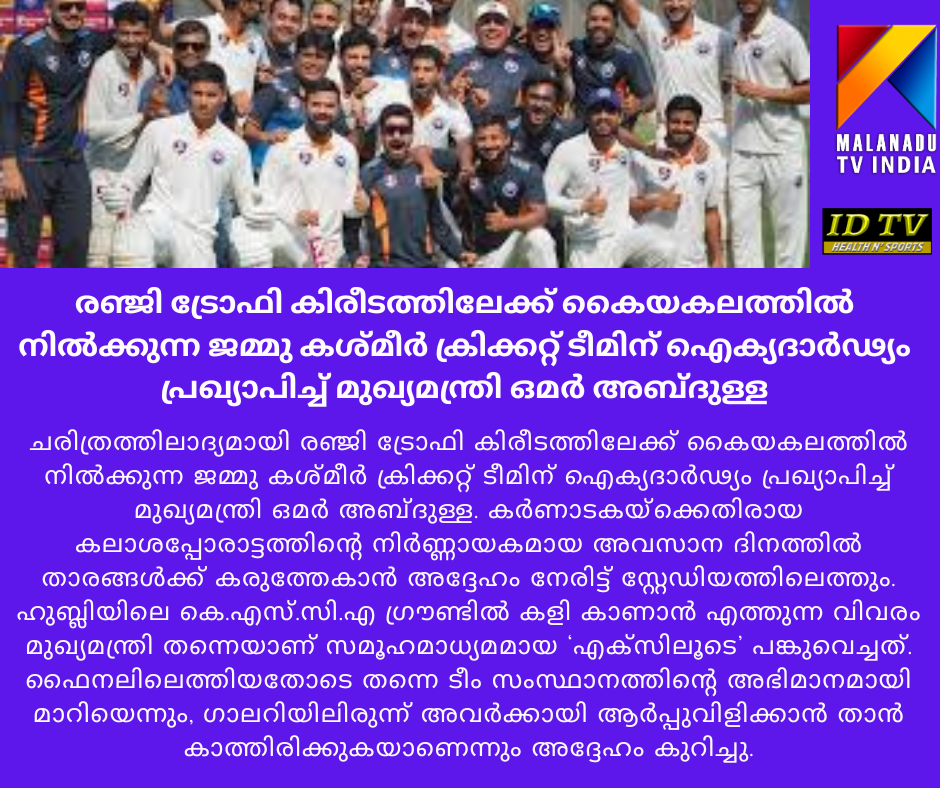 ഹുബ്ലി : ചരിത്രത്തിലാദ്യമായി രഞ്ജി ട്രോഫി കിരീടത്തിലേക്ക് കൈയകലത്തിൽ നിൽക്കുന്ന ജമ്മു കശ്മീർ ക്രിക്കറ്റ് ടീമിന് ഐക്യദാർഢ്യം പ്രഖ്യാപിച്ച് മുഖ്യമന്ത്രി ഒമർ അബ്ദുള്ള. കർണാടകയ്ക്കെതിരായ കലാശപ്പോരാട്ടത്തിന്റെ നിർണ്ണായകമായ അവസാന ദിനത്തിൽ താരങ്ങൾക്ക് കരുത്തേകാൻ അദ്ദേഹം നേരിട്ട് സ്റ്റേഡിയത്തിലെത്തും.ഹുബ്ലിയിലെ കെ.എസ്.സി.എ ഗ്രൗണ്ടിൽ കളി കാണാൻ എത്തുന്ന വിവരം മുഖ്യമന്ത്രി തന്നെയാണ് സമൂഹമാധ്യമമായ ‘എക്സിലൂടെ’ പങ്കുവെച്ചത്. ഫൈനലിലെത്തിയതോടെ തന്നെ ടീം സംസ്ഥാനത്തിന്റെ അഭിമാനമായി മാറിയെന്നും, ഗാലറിയിലിരുന്ന് അവർക്കായി ആർപ്പുവിളിക്കാൻ താൻ കാത്തിരിക്കുകയാണെന്നും അദ്ദേഹം കുറിച്ചു.ആദ്യ ഇന്നിംഗ്സിൽ കൂറ്റൻ സ്കോർ പടുത്തുയർത്തിയ ജമ്മു കശ്മീർ നിലവിൽ കിരീടത്തിന് തൊട്ടരികിലാണ്. ആദ്യ ഇന്നിംഗ്ഗ്സില് ജമ്മു കശ്മീർ 584 റൺസ് നേടിയപ്പോൾ മറുപടി ബാറ്റിംഗിനിറങ്ങിയ കർണാടക 293 റൺസിന് പുറത്തായി. 291 റൺസിന്റെ കൂറ്റൻ ലീഡാണ് കശ്മീർ സ്വന്തമാക്കിയത്. ഈ സീസണിലെ തന്റെ തകർപ്പൻ ഫോം തുടരുന്ന പേസർ ആഖിബ് നബി 54 റൺസിന് 5 വിക്കറ്റ് വീഴ്ത്തി കർണാടകയുടെ നടുവൊടിച്ചു. നാലാം ദിനം കളി അവസാനിക്കുമ്പോൾ ജമ്മു കശ്മീർ രണ്ടാം ഇന്നിംഗ്സില് 4 വിക്കറ്റ് നഷ്ടത്തിൽ 186 റൺസ് എന്ന നിലയിലാണ്. 94 റൺസുമായി പുറത്താകാതെ നിൽക്കുന്ന ഓപ്പണർ ഖമ്രാൻ ഇക്ബാലാണ് കശ്മീരിനെ സുരക്ഷിത സ്ഥാനത്ത് എത്തിച്ചത്.ക്യാപ്റ്റൻ പരസ് ദോഗ്രയുടെ നേതൃത്വത്തിലിറങ്ങുന്ന ജമ്മു കശ്മീർ ടീം, അഞ്ചാം ദിനം വലിയ അട്ടിമറികളൊന്നും സംഭവിച്ചില്ലെങ്കിൽ ഒന്നാം ഇന്നിംഗ്സ് ലീഡിന്റെ കരുത്തില് ചരിത്രത്തിലാദ്യമായി രഞ്ജി ട്രോഫിയിൽ മുത്തമിടും. മുഖ്യമന്ത്രിയുടെ സാന്നിധ്യം താരങ്ങളുടെ ആത്മവിശ്വാസം വർധിപ്പിക്കുമെന്നുറപ്പാണ്.