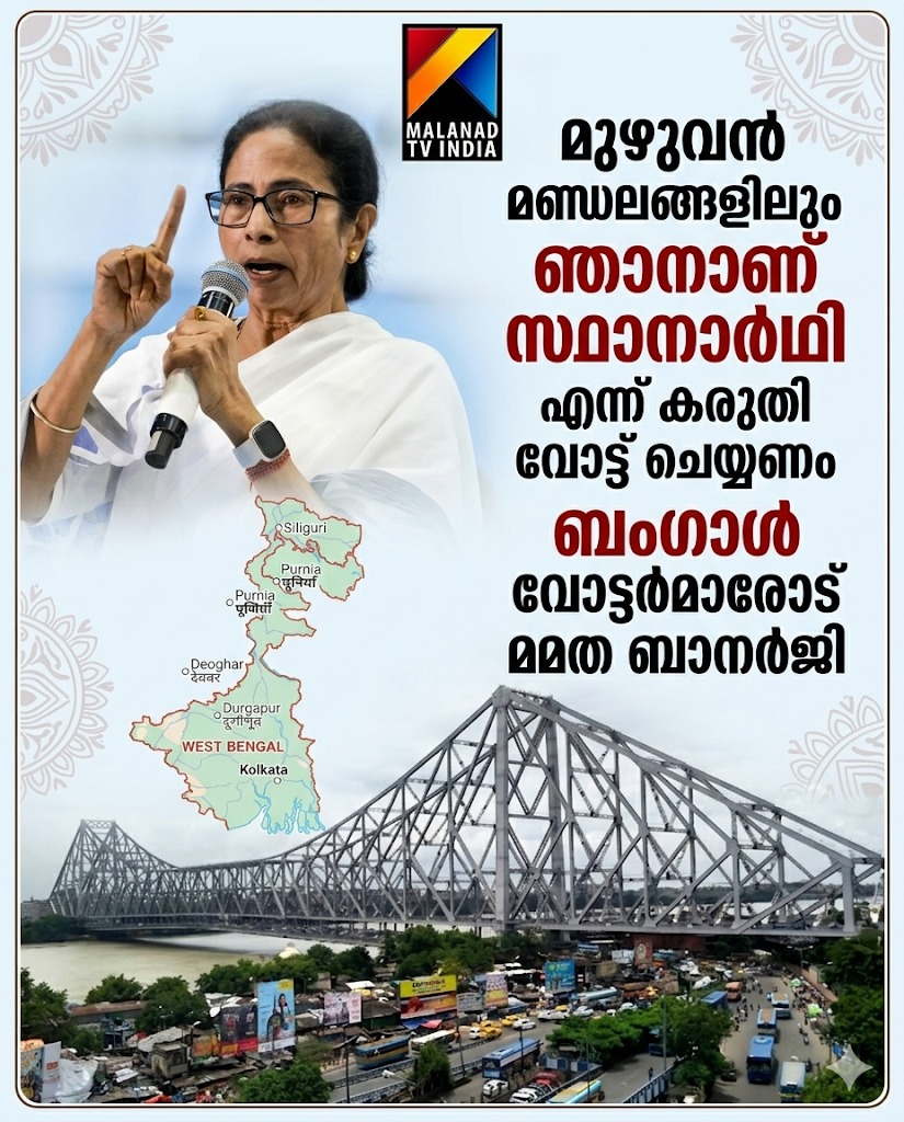 സംസ്ഥാനത്തെ മുഴുവൻ നിയമസഭ മണ്ഡലങ്ങളിലേയും സ്ഥാനാർഥി താനാണെന്ന് കരുതി ടിഎംസിക്ക് വോട്ട് ചെയ്യണമെന്ന് തൃണമൂൽകോൺഗ്രസ് നേതാവും ബംഗാൾ മുഖ്യമന്ത്രിയുമായി മമത ബാനർജി.
