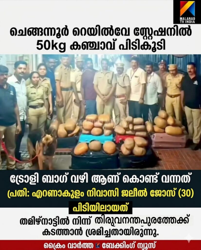 ചെങ്ങന്നൂർ റെയിൽവേ സ്റ്റേഷനിൽ 50kg കഞ്ചാവ് പിടികൂടി, ട്രോളി ബാഗ് വഴി ആണ് കൊണ്ട് വന്നത്, എറണാകുളം നിവാസി ജലീൽ ജോസ് (30)ആണ് പിടിയിൽ. മേഖാലയിൽ നിന്ന് ട്രെയിൻ മാർഗം ചെങ്ങന്നൂർ എത്തിച്ചു വിതരണം ആയിരുന്നു ലക്ഷ്യം. ചെങ്ങന്നൂർ എക്സൈസ് ടീം ഉം, RPF ആണ് പിടിക്കൂടിയത്, Excice ഇൻസ്പെക്ടർ. സജീവ്, ജോഷി ജോൺ, ബിജു, ബീനോയ്, അശ്വിൻ, സിജു, പ്രവീൺ, വിഷ്ണു, വിജയലക്ഷ്മി, ആശ എന്നിവർ ഉണ്ടായിരുന്നു… റിപ്പോർട്ട് :അനീഷ് ചുനക്കര