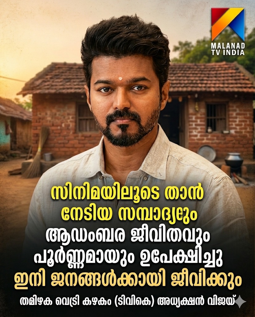 സിനിമയിലൂടെ താൻ നേടിയ സമ്പാദ്യവും ആഡംബര ജീവിതവും പൂർണ്ണമായും ഉപേക്ഷിച്ചുവെന്നും ഇനി തന്റെ ജീവിതം ജനങ്ങളെ സേവിക്കാനാണെന്നും പ്രഖ്യാപിച്ച് തമിഴക വെട്രി കഴകം (ടിവികെ) അധ്യക്ഷൻ വിജയ്.