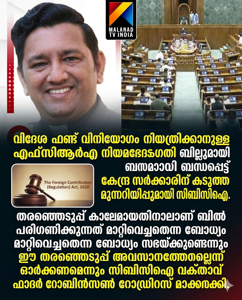 എഫ്സിആർഎ ഭേദഗതി ബിൽ താൽക്കാലികമായി മാത്രമാണ് സർക്കാർ മാറ്റിവെച്ചിരിക്കുന്നത്. ഇതിൽ സഭയ്ക്ക് വലിയ ആശങ്കയുണ്ട്. ജനങ്ങൾ ബുദ്ധിയുള്ളവരാണെന്നും വരാനിരിക്കുന്ന തിരഞ്ഞെടുപ്പുകളിൽ ഇതിന്റെ പ്രതിഫലനമുണ്ടാകുമെന്നും സഭ മുന്നറിയിപ്പ് നൽകി. ബില്ലിലെ വിവാദ വ്യവസ്ഥകൾ നീക്കം ചെയ്യണമെന്ന ആവശ്യവുമായി സിബിസിഐ പ്രതിനിധി സംഘം പ്രധാനമന്ത്രി നരേന്ദ്ര മോദിയെയും കേന്ദ്ര ആഭ്യന്തര മന്ത്രി അമിത് ഷായെയും നേരിട്ട് കണ്ട് ആശങ്കയറിയിക്കും. രാജ്യത്തെ സന്നദ്ധ സംഘടനകളുടെയും ന്യൂനപക്ഷ സ്ഥാപനങ്ങളുടെയും പ്രവർത്തനത്തെ തളർത്തുന്ന രീതിയിൽ വിദേശ ഫണ്ട് വിനിയോഗത്തിൽ കടുത്ത നിയന്ത്രണങ്ങൾ ഏർപ്പെടുത്തുന്നതാണ് പുതിയ ഭേദഗതി. ഇത് സാമൂഹിക സേവന രംഗത്ത് വലിയ പ്രതിസന്ധിയുണ്ടാക്കും. പ്രതിപക്ഷത്തിന്റെ ശക്തമായ പ്രതിഷേധത്തെത്തുടർന്നാണ് ഇന്നലെ ലോക്സഭയിൽ ബിൽ പരിഗണിക്കുന്നത് മാറ്റിവെച്ചത്. എന്നാൽ ഇത് തിരഞ്ഞെടുപ്പ് തന്ത്രം മാത്രമാണെന്നാണ് സഭയുടെ വിലയിരുത്തൽ. ജനാധിപത്യ പ്രക്രിയയിൽ ജനങ്ങൾ ബുദ്ധിപൂർവ്വം വോട്ട് ചെയ്യണമെന്നും സഭാ വക്താവ് കൂട്ടിച്ചേർത്തു