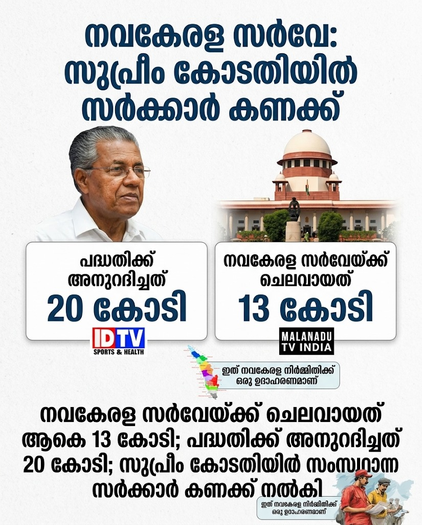 നവകേരള സര്വേ സ്റ്റേ ചെയ്ത ഹൈക്കോടതി ഉത്തരവിനെതിരെയാണ് സംസ്ഥാന സര്ക്കാര് സുപ്രീംകോടതിയെ സമീപിച്ചത്. നവകേരള സര്വേയുമായി മുന്നോട്ടുപോകാമെന്ന അനുകൂല ഉത്തരവാണ് സുപ്രീംകോടതിയില് നിന്ന് സംസ്ഥാന സര്ക്കാര് സമ്പാദിച്ചത്. എന്നാല് ചെലവാക്കിയ കണക്കുകള് അറിയിക്കാനും സുപ്രീംകോടതി നിര്ദേശിച്ചിരുന്നു. കേസ് നാളെ വീണ്ടും സുപ്രീംകോടതി പരിഗണിക്കാനിരിക്കേ യാണ് സംസ്ഥാന സര്ക്കാര് കണക്ക് നല്കിയത്.