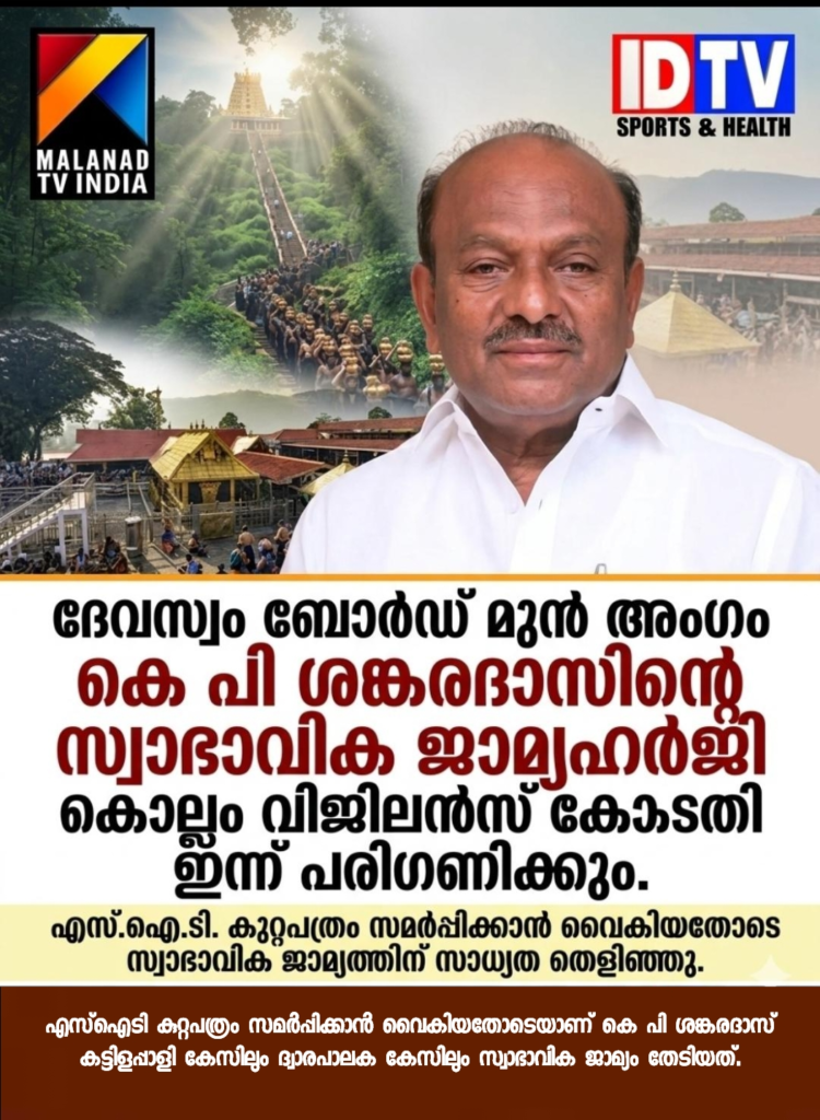 ശബരിമല സ്വർണ്ണക്കൊള്ള കേസിൽ ജയിലിൽ കഴിയുന്ന അവസാന പ്രതിയും പുറത്തേക്ക്. ദേവസ്വം ബോർഡ് മുൻ അംഗം കെ പി ശങ്കരദാസിൻ്റെ സ്വാഭാവിക ജാമ്യഹർജി കൊല്ലം വിജിലൻസ് കോടതി ഇന്ന് പരിഗണിക്കും. എസ്ഐടി കുറ്റപത്രം സമർപ്പിക്കാൻ വൈകിയതോടെയാണ് കെ പി ശങ്കരദാസ് കട്ടിളപ്പാളി കേസിലും ദ്വാരപാലക കേസിലും സ്വാഭാവിക ജാമ്യം തേടിയത്.