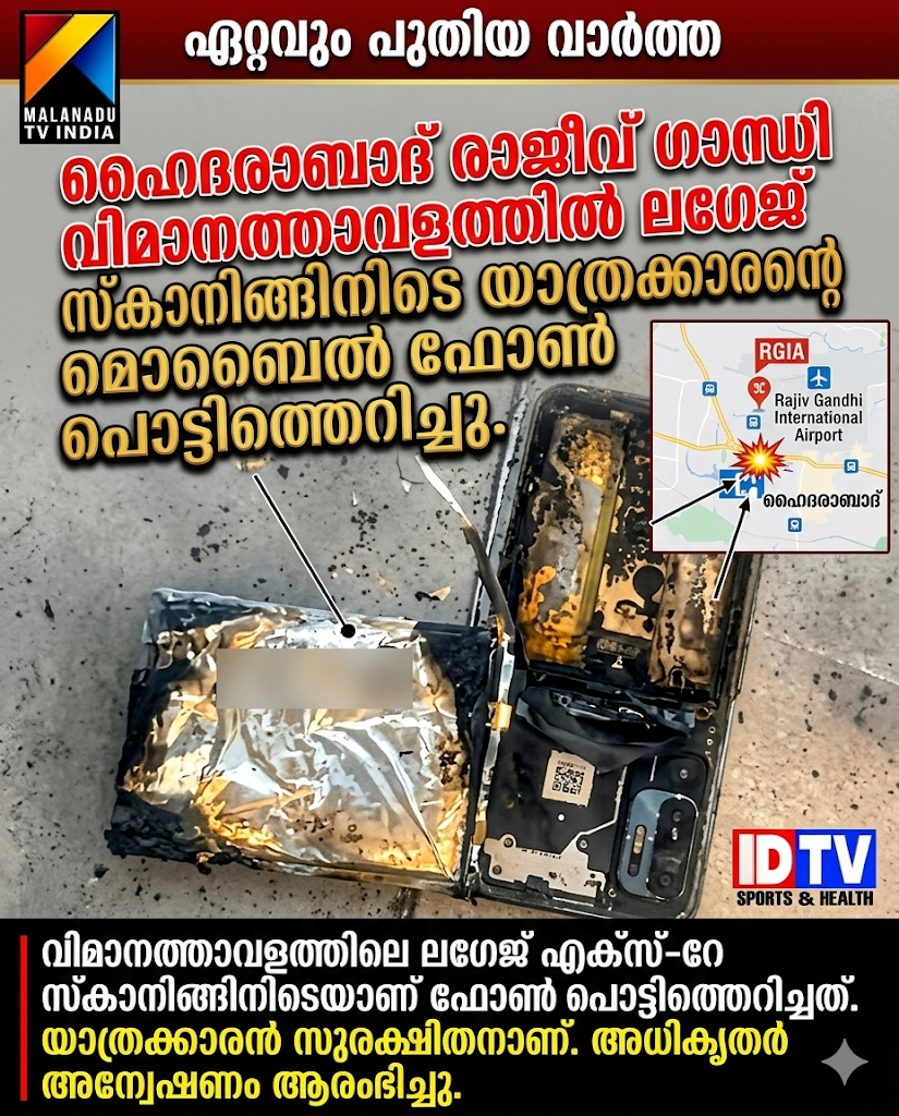 രാജീവ് ഗാന്ധി അന്താരാഷ്ട്ര വിമാനത്താവളത്തിൽ ലഗേജ് സ്കാനിങ്ങിനിടെ യാത്രക്കാരന്റെ മൊബൈൽ ഫോൺ പൊട്ടിത്തെറിച്ചു.ശംഷാബാദ് വിമാനത്താവളത്തിലെ ആഭ്യന്തര പുറപ്പെടൽ വിഭാഗത്തിൽ വെച്ചാണ് സംഭവം. സ്ഫോടനത്തെത്തുടർന്ന് സുരക്ഷാ ഉദ്യോഗസ്ഥരും യാത്രക്കാരും ഒരുപോലെ പരിഭ്രാന്തരായി.റായ്പൂരിലേക്ക് പോകാനെത്തിയ ലക്ഷ്മൺ പ്രസാദ് എന്നയാളുടെ ബാഗിലുണ്ടായിരുന്ന ഫോണാണ് പൊട്ടിത്തെറിച്ചത്.ശംഷാബാദ് വിമാനത്താവളത്തിലെ ആഭ്യന്തര പുറപ്പെടൽ വിഭാഗത്തിൽ വെച്ചാണ് സംഭവം. സ്ഫോടനത്തെത്തുടർന്ന് സുരക്ഷാ ഉദ്യോഗസ്ഥരും യാത്രക്കാരും ഒരുപോലെ പരിഭ്രാന്തരായി.റായ്പൂരിലേക്ക് പോകാനെത്തിയ ലക്ഷ്മൺ പ്രസാദ് എന്നയാളുടെ ബാഗിലുണ്ടായിരുന്ന ഫോണാണ് പൊട്ടിത്തെറിച്ചത്.