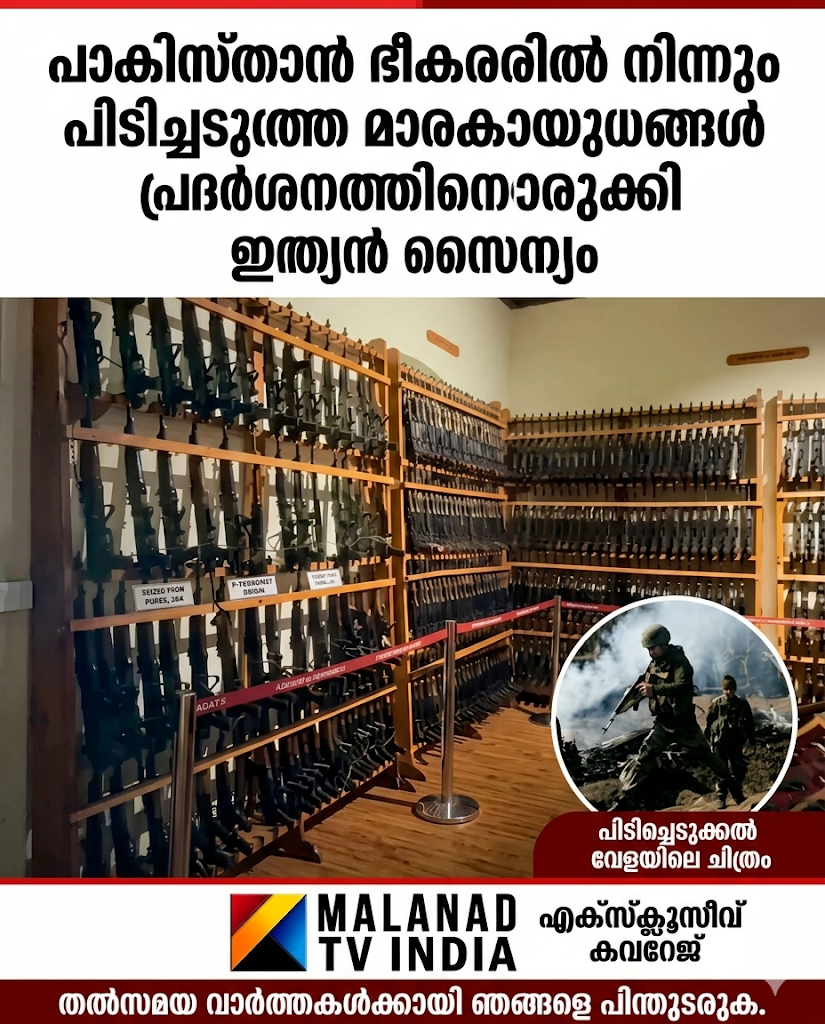 പാകിസ്താൻ ഭീകരരിൽ നിന്നും പിടിച്ചെടുത്ത മാരകായുധങ്ങൾ പ്രദർശനത്തിനൊരുക്കി ഇന്ത്യൻ സൈന്യം
