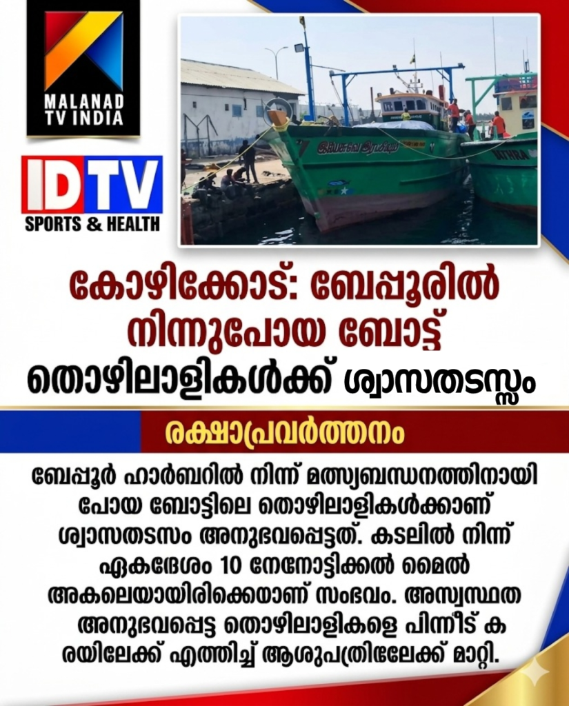 കോഴിക്കോട്: ബേപ്പൂർ ഹാർബറിൽ നിന്ന് മത്സ്യബന്ധനത്തിനായി പോയ ബോട്ടിലെ തൊഴിലാളികൾക്ക് ശ്വാസതടസം അനുഭവപ്പെട്ടു. ‘ആയിഷ’ എന്ന ബോട്ടിലെ 12 പേരാണ് സംഭവസമയം ബോട്ടിലുണ്ടായിരുന്നത്. ബോട്ടിന്റെ എഞ്ചിൻ റൂമിലേക്ക് വെള്ളം കയറിയതിനെ തുടർന്ന് അത് പരിശോധിക്കാൻ പോയപ്പോഴാണ് ചിലർക്കു ശ്വാസതടസം അനുഭവപ്പെട്ടത്. ഇതിൽ നാലുപേർ ദേഹാസ്വാസ്ഥ്യത്തെ തുടർന്ന് കുഴഞ്ഞുവീണു.
