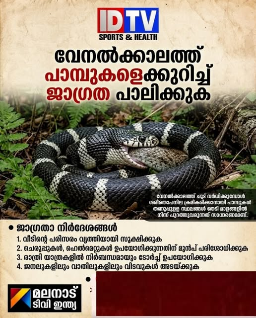 വേനൽക്കാലത്ത് ചൂട് വർധിക്കുമ്പോൾ ശരീരതാപനില ക്രമീകരിക്കാനായി പാമ്പുകൾ തണുപ്പുള്ള സ്ഥലങ്ങൾ തേടി മാളങ്ങളിൽ നിന്ന് പുറത്തുവരുന്നത് സാധാരണമാണ്. ഈ സാഹചര്യത്തിൽ വീടിനകത്തും പരിസരത്തും പ്രത്യേക ശ്രദ്ധ ആവശ്യമാണ്.