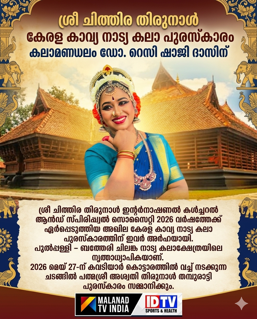 പുൽപ്പള്ളി: ശ്രീ ചിത്തിര തിരുനാൾ ഇന്റർനാഷണൽ കൾച്ചറൽ ആൻഡ് സ്പിരിച്വൽ സൊസൈറ്റി 2026 വർഷത്തേക്ക് ഏർപ്പെടുത്തിയ അഖില കേരള കാവ്യ നാട്യ കലാ പുരസ്കാരത്തിന് കലാമണ്ഡലം ഡോ. റെസി ഷാജി ദാസ് അർഹയായി. പുൽപ്പള്ളി – ബത്തേരി ചിലങ്ക നാട്യ കലാക്ഷേത്രയിലെ നൃത്താധ്യാപികയായ ഇവർക്ക് 2026 മെയ് 27-ന് കവടിയാർ കൊട്ടാരത്തിൽ വച്ച് നടക്കുന്ന ചടങ്ങിൽ പത്മശ്രീ അശ്വതി തിരുനാൾ തമ്പുരാട്ടി പുരസ്കാരം സമ്മാനിക്കും. ബി.ജെ.പി പുൽപ്പള്ളി മണ്ഡലം പ്രസിഡന്റും ഒ.ബി.സി മോർച്ച ജില്ലാ പ്രസിഡന്റുമായ പുൽപ്പള്ളി കാര്യപാതികുന്ന് കാരക്കാട് കെ.ഡി. ഷാജിദാസിന്റെ ഭാര്യയാണ് റെസി. മാളവിക, അനൗഷ്ക എന്നിവരാണ് മക്കൾ.